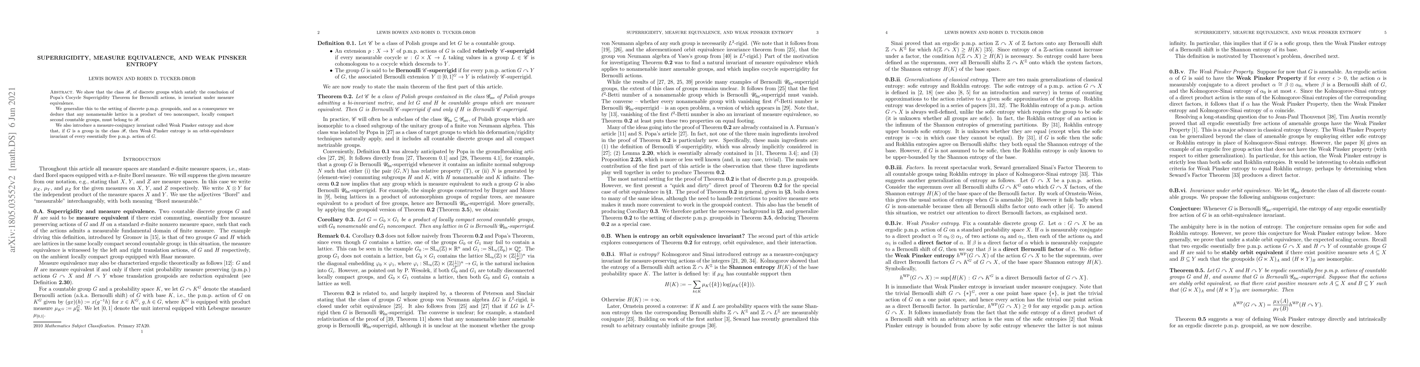 We show that the class $\mathscr{B}$, of discrete groups which satisfy the conclusion of Popa's Cocycle Superrigidity Theorem for Bernoulli actions, is invariant under measure equivalence. We generalize this to the setting of discrete p.m.p. groupoids, and as a consequence we deduce that any nonamenable lattice in a product of two noncompact, locally compact second countable groups, must belong to $\mathscr{B}$. We also introduce a measure-conjugacy invariant called Weak Pinsker entropy and show that, if G is a group in the class $\mathscr{B}$, then Weak Pinsker entropy is an orbit-equivalence invariant of every essentially free p.m.p. action of G.