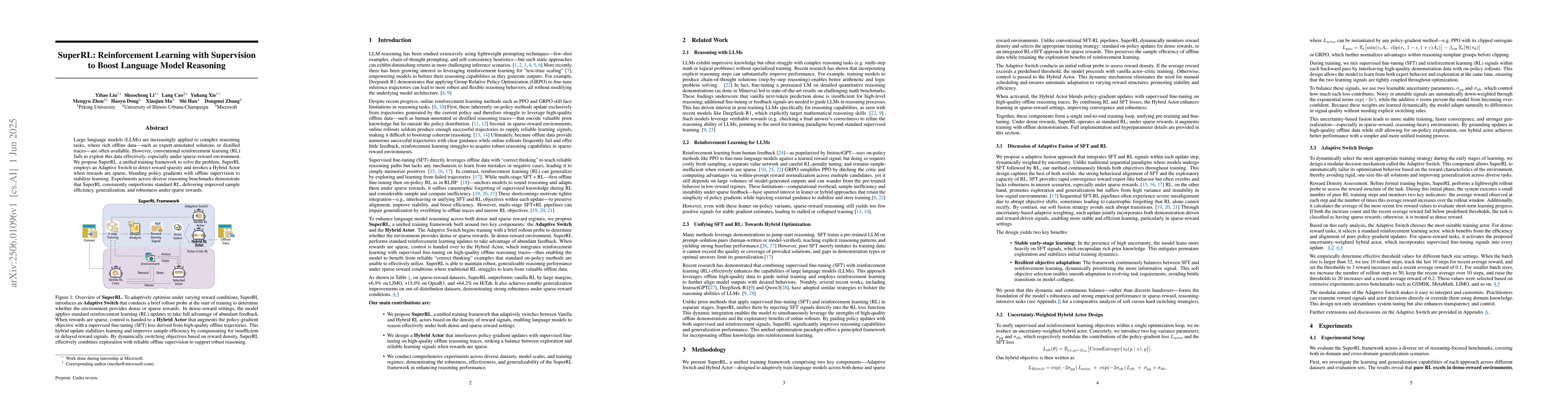 SuperRL improves language model performance on complex reasoning tasks by incorporating offline supervision into reinforcement learning, leading to better sample efficiency and generalization.
