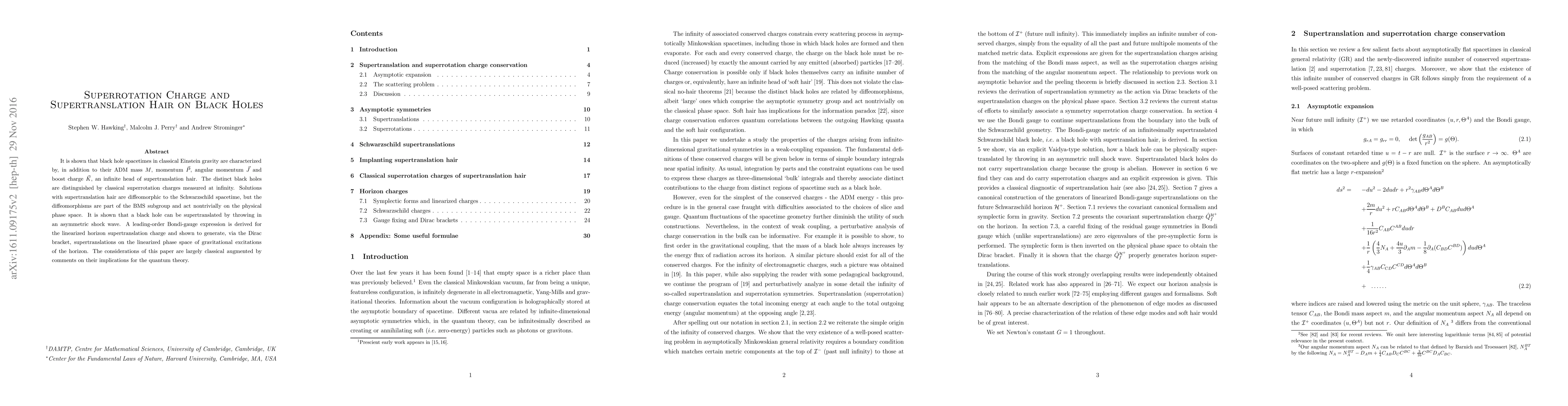 It is shown that black hole spacetimes in classical Einstein gravity are characterized by, in addition to their ADM mass $M$, momentum $\vec P$, angular momentum $\vec J$ and boost charge $\vec K$, an infinite head of supertranslation hair. The distinct black holes are distinguished by classical superrotation charges measured at infinity. Solutions with supertranslation hair are diffeomorphic to the Schwarzschild spacetime, but the diffeomorphisms are part of the BMS subgroup and act nontrivially on the physical phase space. It is shown that a black hole can be supertranslated by throwing in an asymmetric shock wave. A leading-order Bondi-gauge expression is derived for the linearized horizon supertranslation charge and shown to generate, via the Dirac bracket, supertranslations on the linearized phase space of gravitational excitations of the horizon. The considerations of this paper are largely classical augmented by comments on their implications for the quantum theory.