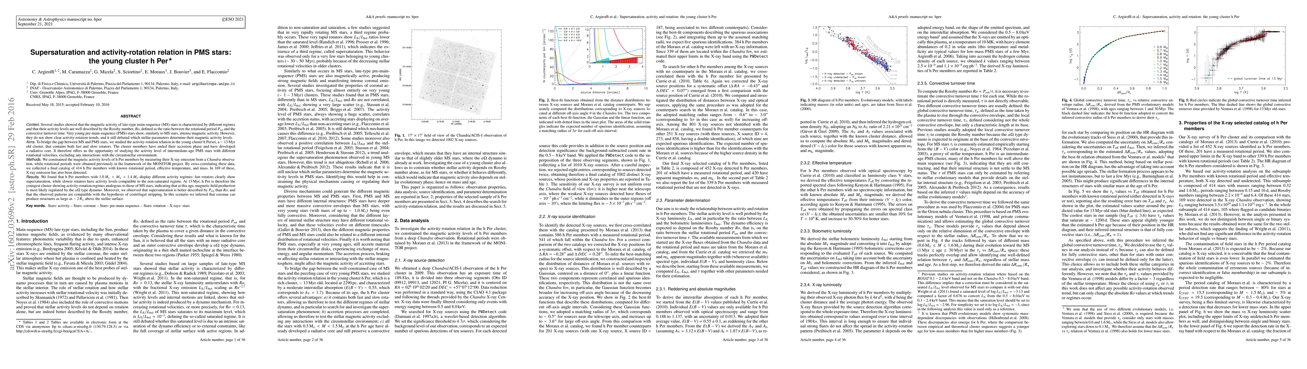 Young stars in the h Per cluster show activity-rotation regimes similar to main-sequence stars, indicating that magnetic field production is regulated by the alpha-Omega dynamo at 13 Myr ages. Supersaturation is better described by P_rot than Ro, and coronae can produce structures up to ~2 R_star above the stellar surface.