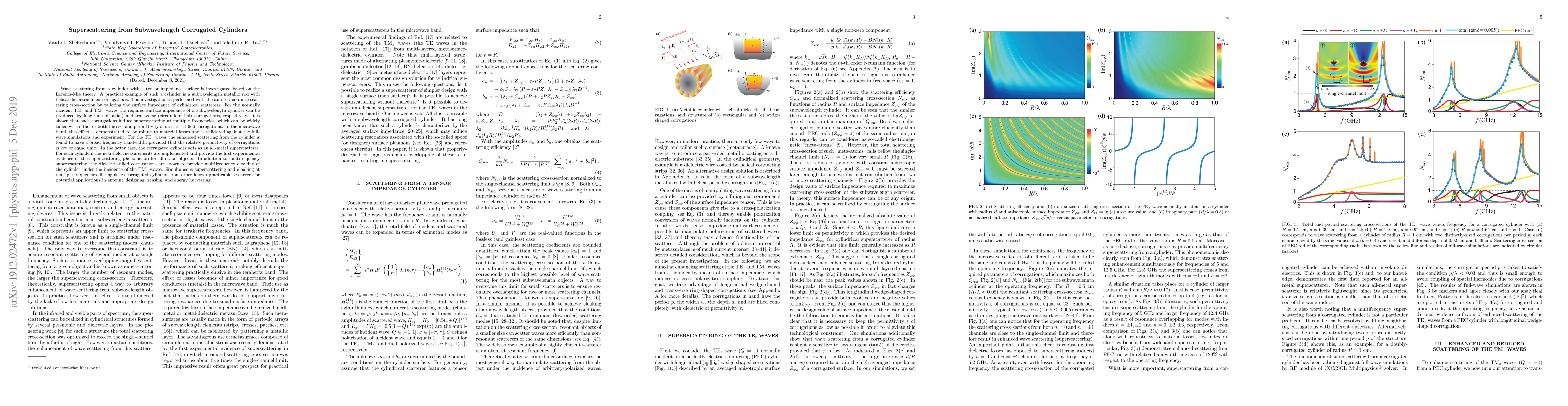 This paper investigates wave scattering from subwavelength metallic rods with helical dielectric-filled corrugations, demonstrating superscattering through tailored surface impedance. The study shows that longitudinal and transverse corrugations can induce superscattering at multiple frequencies, validated by simulations and experiments in the microwave band.