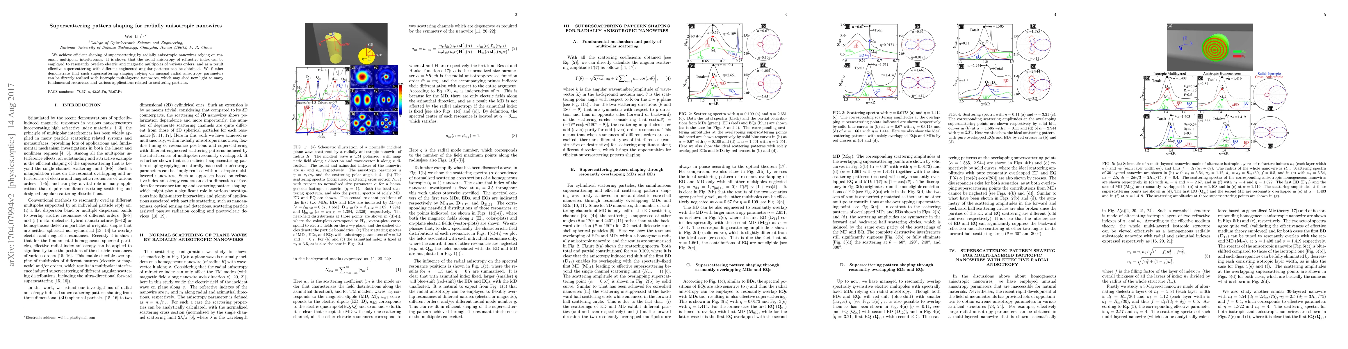 This paper demonstrates the efficient shaping of superscattering using radially anisotropic nanowires through resonant multipolar interferences, showing that the refractive index's radial anisotropy allows for the overlap of electric and magnetic multipoles, leading to engineered angular scattering patterns. The findings suggest that isotropic multi-layered nanowires can achieve similar effects, potentially impacting fundamental research and scattering applications.