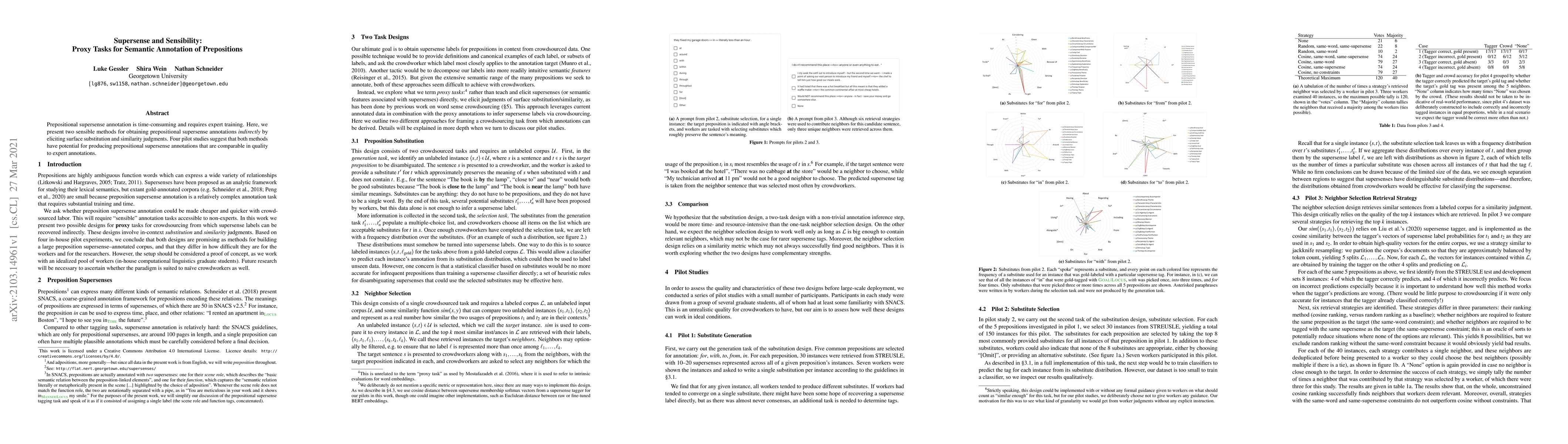 This research proposes two methods to automate the time-intensive process of semantic annotation of prepositions using proxy tasks. Initial pilot studies indicate these methods may yield annotations of comparable quality to expert-generated annotations.