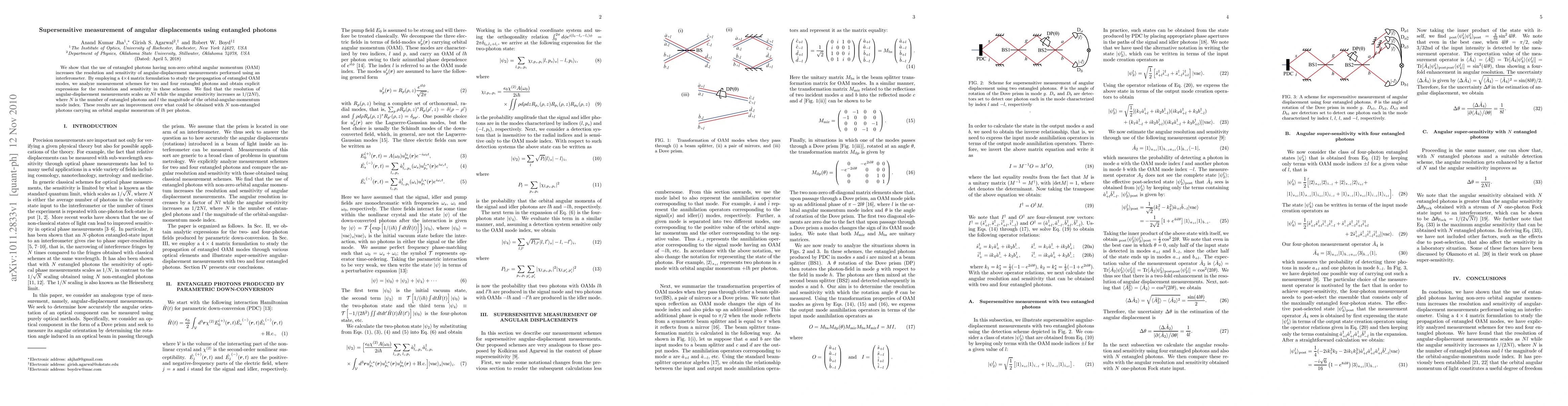 This paper demonstrates that entangled photons with non-zero orbital angular momentum enhance the resolution and sensitivity of angular-displacement measurements via interferometers. The study reveals that the resolution scales as $Nl$ and sensitivity as $1/(2Nl)$, where $N$ is the number of entangled photons and $l$ is the orbital angular momentum mode index, outperforming non-entangled photon measurements.