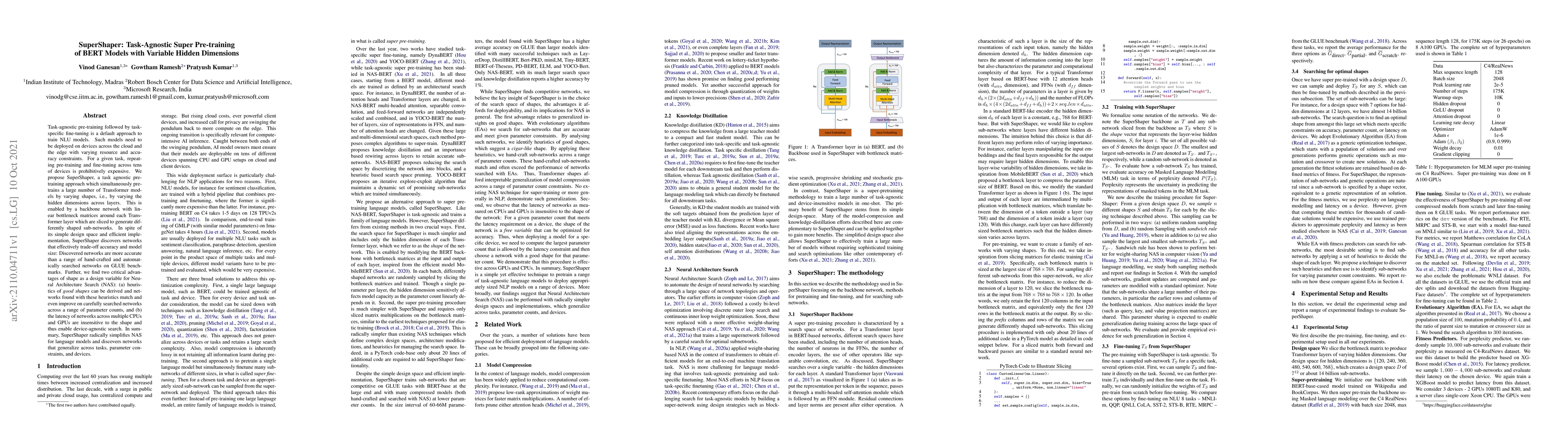 SuperShaper proposes a task-agnostic pre-training method for BERT models that varies hidden dimensions, enabling efficient neural architecture search across devices with different resource constraints. It discovers networks that balance accuracy and model size, outperforming other methods on GLUE benchmarks.