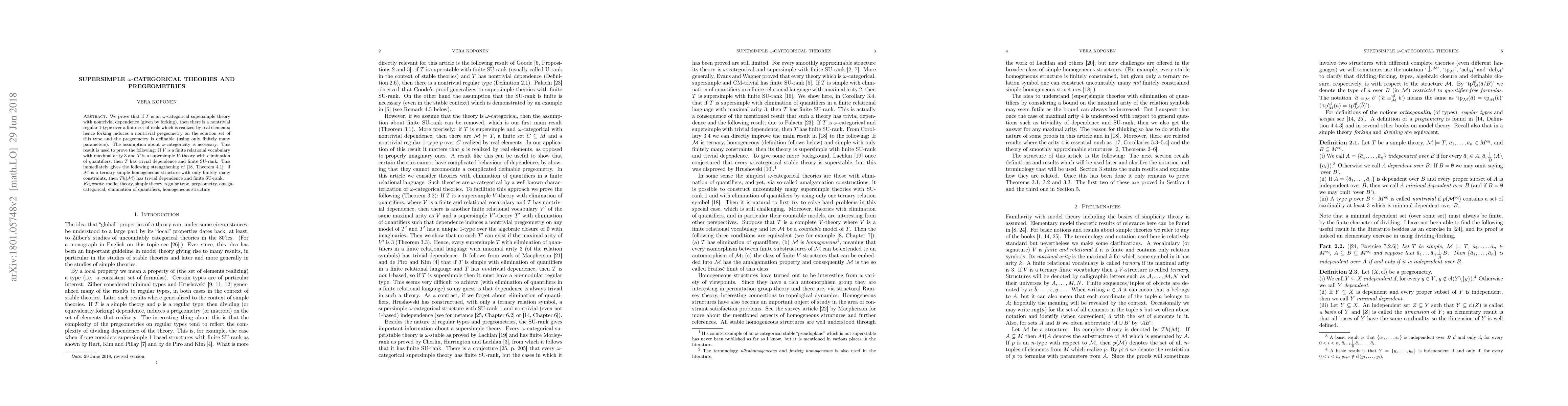 This paper proves that $\omega$-categorical supersimple theories with nontrivial dependence induce a nontrivial definable pregeometry on the solution set of a regular 1-type over finite reals. It also shows that supersimple theories with elimination of quantifiers in finite relational vocabularies of arity at most 3 have trivial dependence and finite SU-rank.