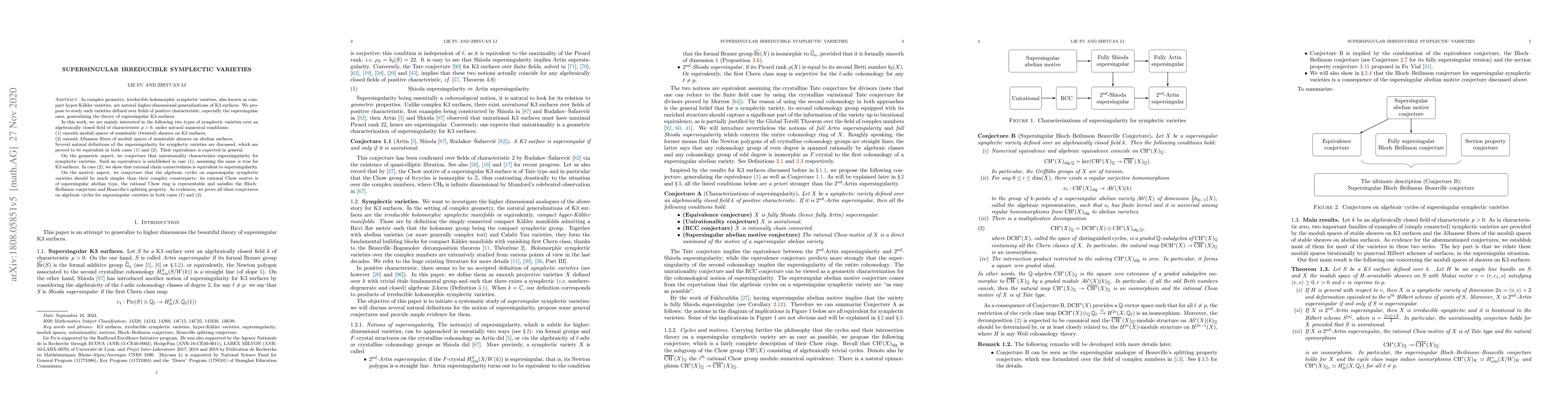 This paper explores symplectic varieties, particularly supersingular ones, in positive characteristic fields, focusing on smooth moduli spaces of sheaves on K3 surfaces and Albanese fibers of abelian surfaces. It establishes equivalences between various definitions of supersingularity and conjectures simpler algebraic cycles for these varieties compared to their complex counterparts.