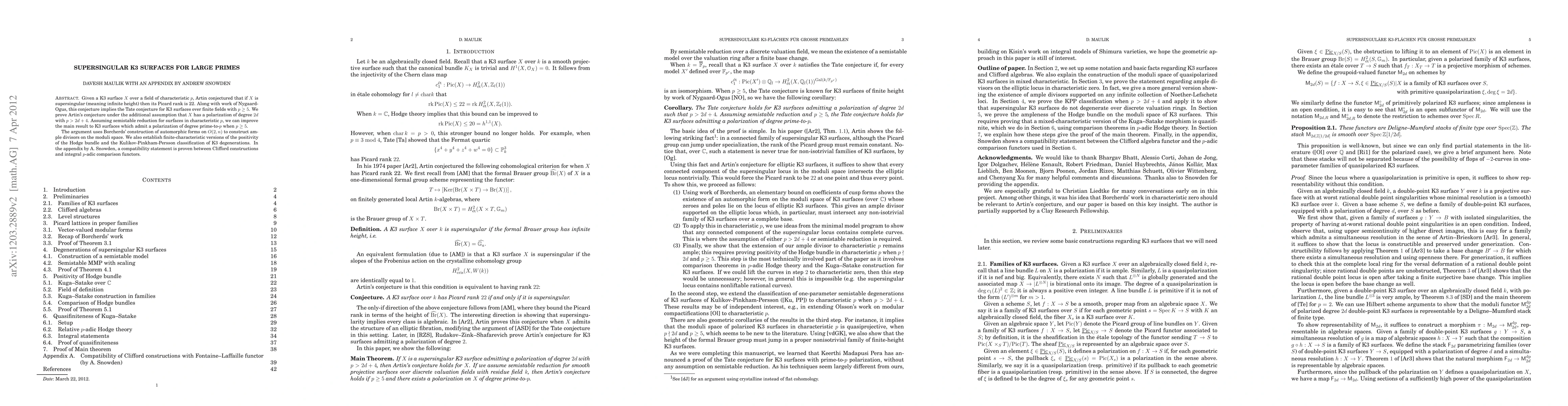 Given a K3 surface X over a field of characteristic p, Artin conjectured that if X is supersingular (meaning infinite height) then its Picard rank is 22. Along with work of Nygaard-Ogus, this conjecture implies the Tate conjecture for K3 surfaces over finite fields with p \geq 5. We prove Artin's conjecture under the additional assumption that X has a polarization of degree 2d with p > 2d+4. Assuming semistable reduction for surfaces in characteristic p, we can improve the main result to K3 surfaces which admit a polarization of degree prime-to-p when p \geq 5. The argument uses Borcherds' construction of automorphic forms on O(2,n) to construct ample divisors on the moduli space. We also establish finite-characteristic versions of the positivity of the Hodge bundle and the Kulikov-Pinkham-Persson classification of K3 degenerations. In the appendix by A. Snowden, a compatibility statement is proven between Clifford constructions and integral p-adic comparison functors.