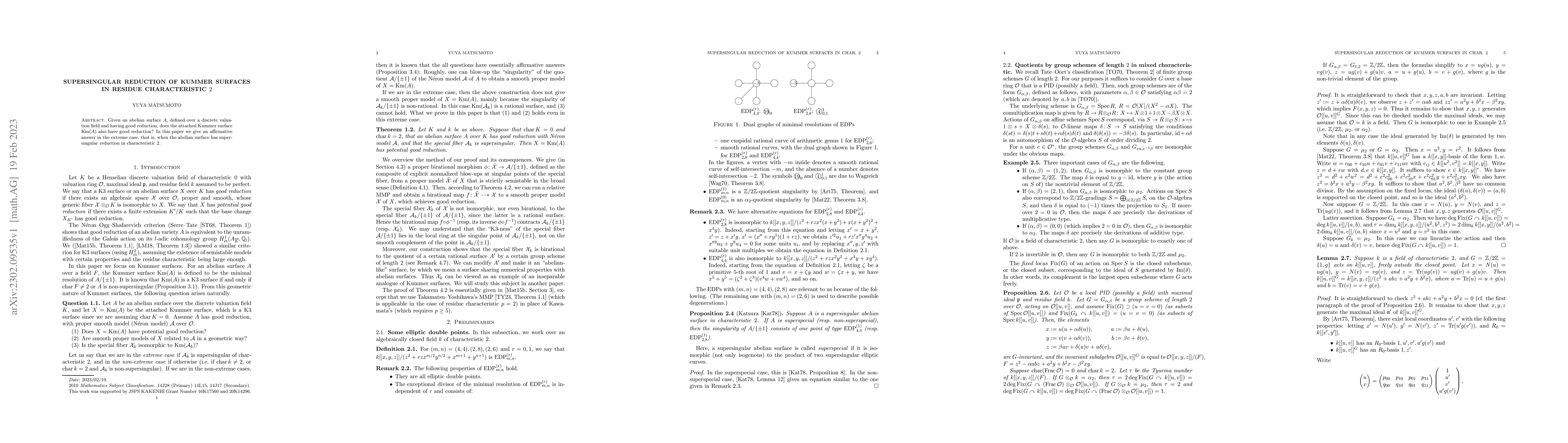 Summary: This paper confirms that the Kummer surface associated with a supersingular abelian surface over a discrete valuation field retains good reduction, specifically in residue characteristic 2. The affirmative result addresses the reduction behavior in the extreme case of supersingularity.