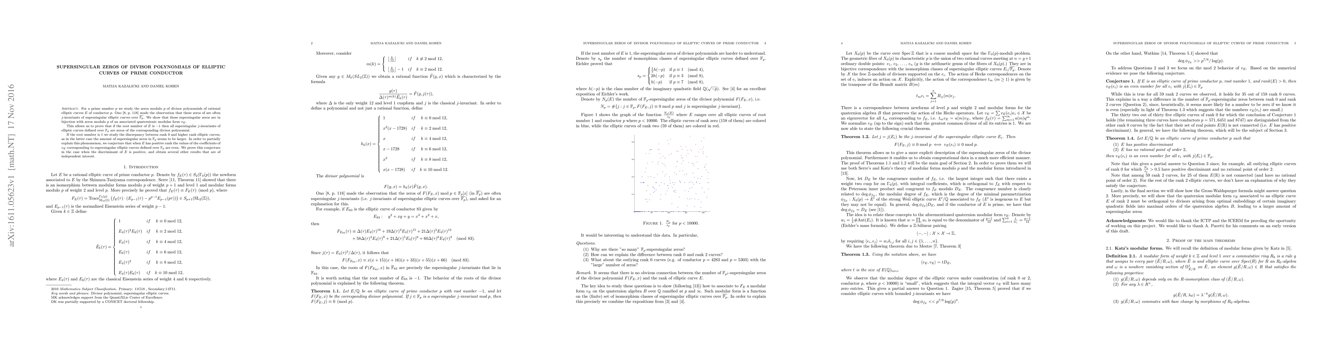 This paper studies the zeros modulo $p$ of divisor polynomials of elliptic curves with prime conductor $p$, linking them to supersingular $j$-invariants and quaternionic modular forms. It proves that if the root number is $-1$, all supersingular $j$-invariants are zeros of the divisor polynomial, and conjectures that for positive rank curves, coefficients of the associated quaternionic modular form corresponding to supersingular curves are even.