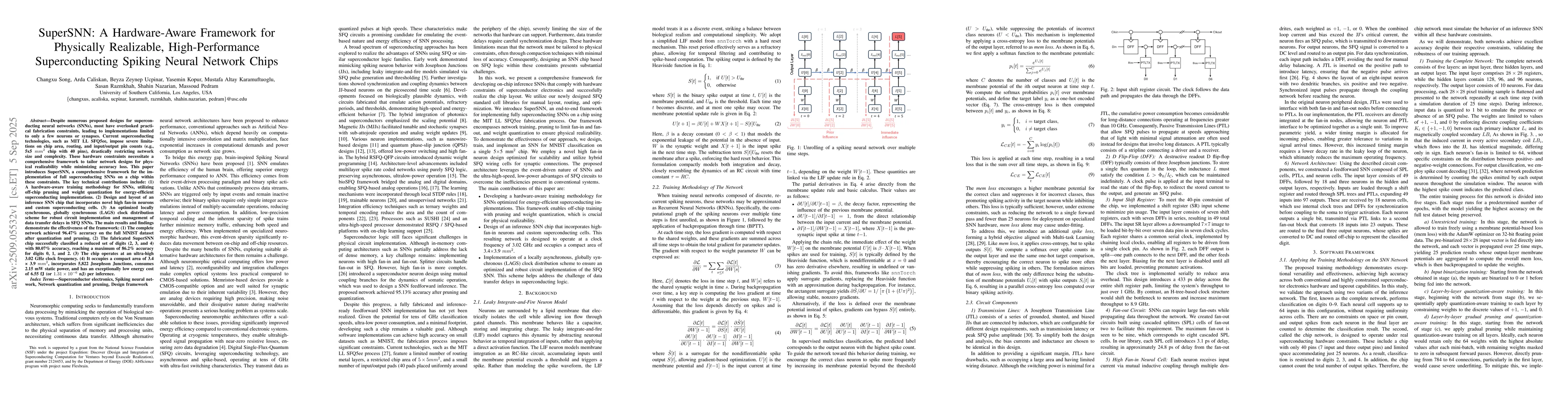 Despite numerous proposed designs for superconducting neural networks (SNNs), most have overlooked practical fabrication constraints, leading to implementations limited to only a few neurons or synapses. Current superconducting technologies, such as MIT LL SFQ5ee, impose severe limitations on chip area, routing, and input/output pin counts (e.g., 5x5 mm^2 chip with 40 pins), drastically restricting network size and complexity. These hardware constraints necessitate a comprehensive framework to tailor network designs for physical realizability while minimizing accuracy loss. This paper introduces SuperSNN, a comprehensive framework for the implementation of full superconducting SNNs on a chip within these constraints. The key technical contributions include: (1) A hardware-aware training methodology for SNNs, utilizing off-chip pruning and weight quantization for energy-efficient superconducting implementations. (2) Design and layout of an inference SNN chip that incorporates novel high fan-in neurons and custom superconducting cells. (3) An optimized locally synchronous, globally synchronous (LAGS) clock distribution scheme for robust circuit implementation and management of data transfer delays in SFQ SNNs. The main results and findings demonstrate the effectiveness of the framework: (1) The complete network achieved 96.47% accuracy on the full MNIST dataset after quantization and pruning. (2) The fabricated SuperSNN chip successfully classified a reduced set of digits (2, 3, and 4) with 80.07% accuracy, reaching a maximum of 86.2% accuracy for digits 0, 1, and 2. (3) The chip operates at an ultra-high 3.02 GHz clock frequency. (4) It occupies a compact area of 3.4 x 3.9 mm^2, incorporates 5,822 Josephson Junctions, consumes 2.15 mW static power, and has an exceptionally low energy cost of 6.55 fJ (or 1.31e-6 nJ) per inference.