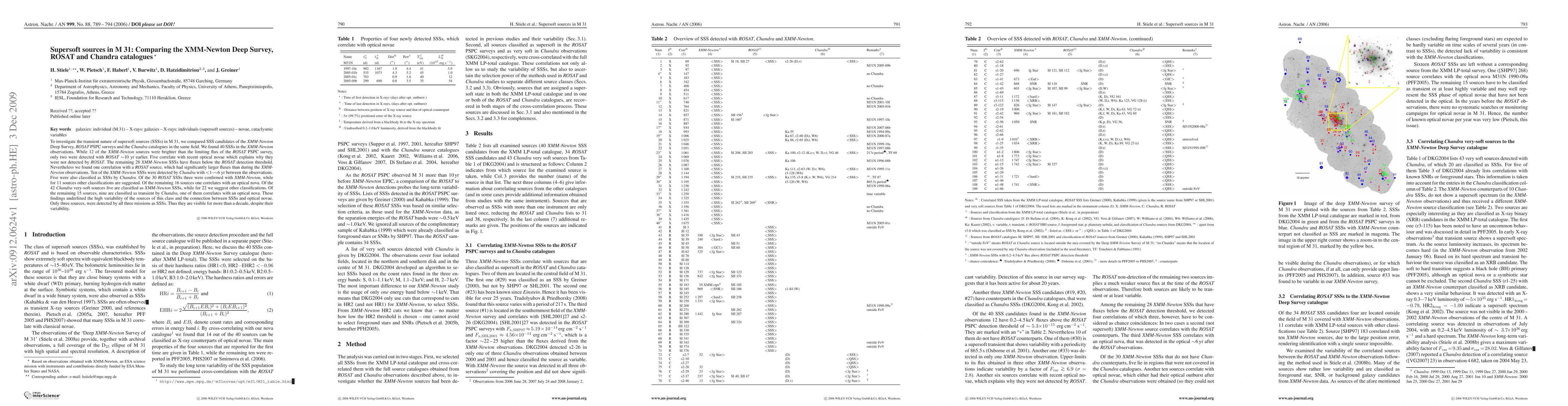 This study compares supersoft source (SSS) candidates from XMM-Newton, ROSAT, and Chandra observations in M 31, revealing the high variability of these sources. While 40 SSSs were found in XMM-Newton data, only a few were detected by ROSAT and Chandra, highlighting the transient nature of SSSs and their association with optical novae.