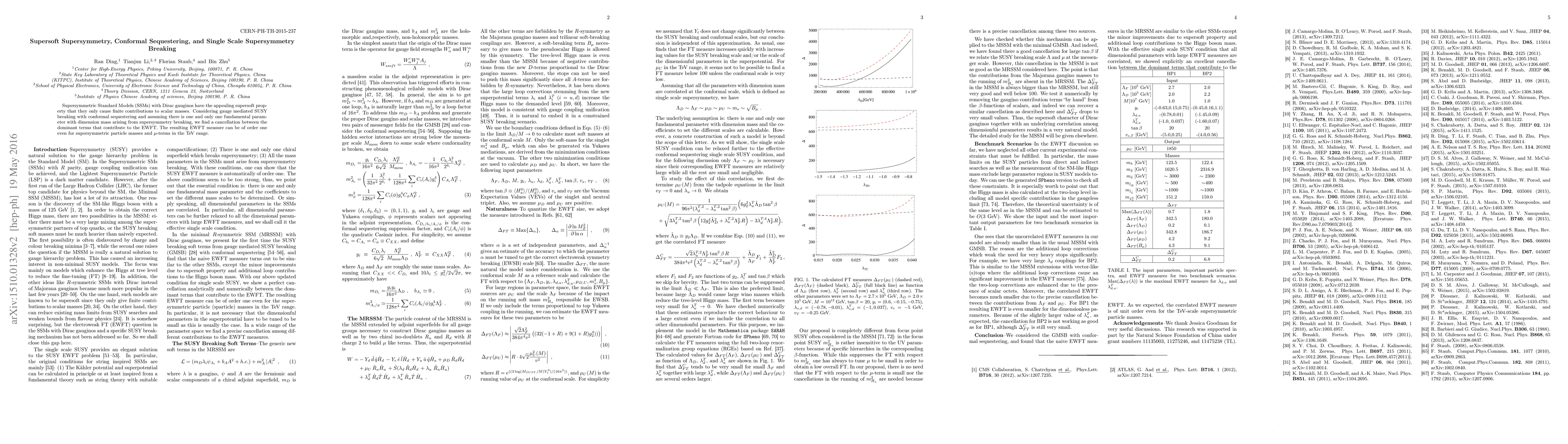 Supersymmetric Standard Models (SSMs) with Dirac gauginos have the appealing supersoft property that they only cause finite contributions to scalar masses. Considering gauge mediated SUSY breaking with conformal sequestering and assuming there is one and only one fundamental parameter with dimension mass arising from supersymmetry breaking, we find a cancellation between the dominant terms that contribute to the EWFT. The resulting EWFT measure can be of order one even for supersymmetric particle masses and $\mu$-terms in the TeV range.