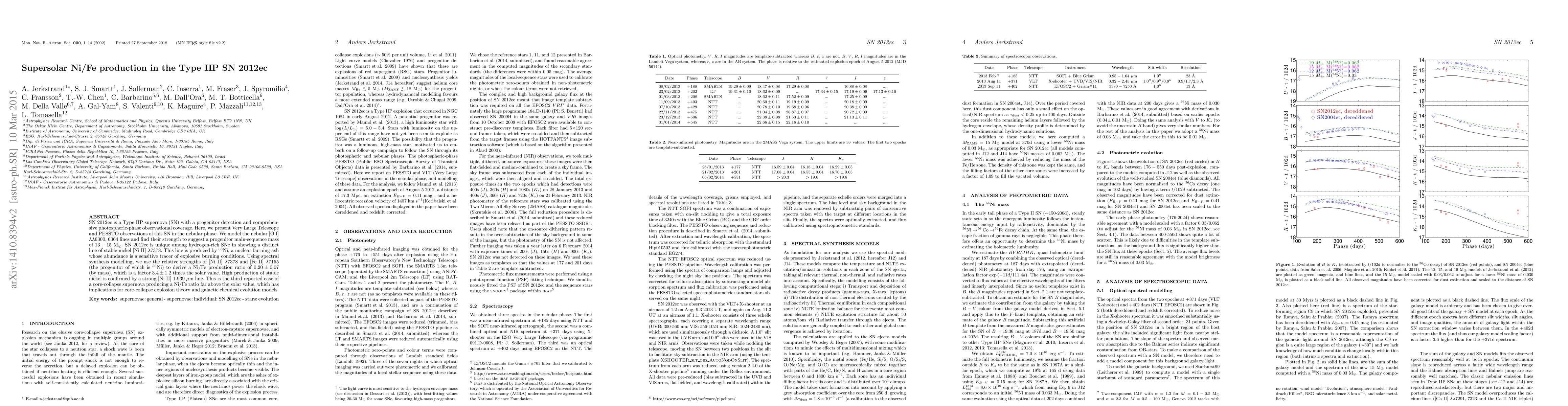 SN 2012ec is a Type IIP supernova (SN) with a progenitor detection and comprehensive photospheric-phase observational coverage. Here, we present Very Large Telescope and PESSTO observations of this SN in the nebular phase. We model the nebular [O I] 6300, 6364 lines and find their strength to suggest a progenitor main-sequence mass of 13-15 Msun. SN 2012ec is unique among hydrogen-rich SNe in showing a distinct and unblended line of stable nickel [Ni II] 7378. This line is produced by 58Ni, a nuclear burning ash whose abundance is a sensitive tracer of explosive burning conditions. Using spectral synthesis modelling, we use the relative strengths of [Ni II] 7378 and [Fe II] 7155 (the progenitor of which is 56Ni) to derive a Ni/Fe production ratio of 0.20pm0.07 (by mass), which is a factor 3.4pm1.2 times the solar value. High production of stable nickel is confirmed by a strong [Ni II] 1.939 micron line. This is the third reported case of a core-collapse supernova producing a Ni/Fe ratio far above the solar value, which has implications for core-collapse explosion theory and galactic chemical evolution models.