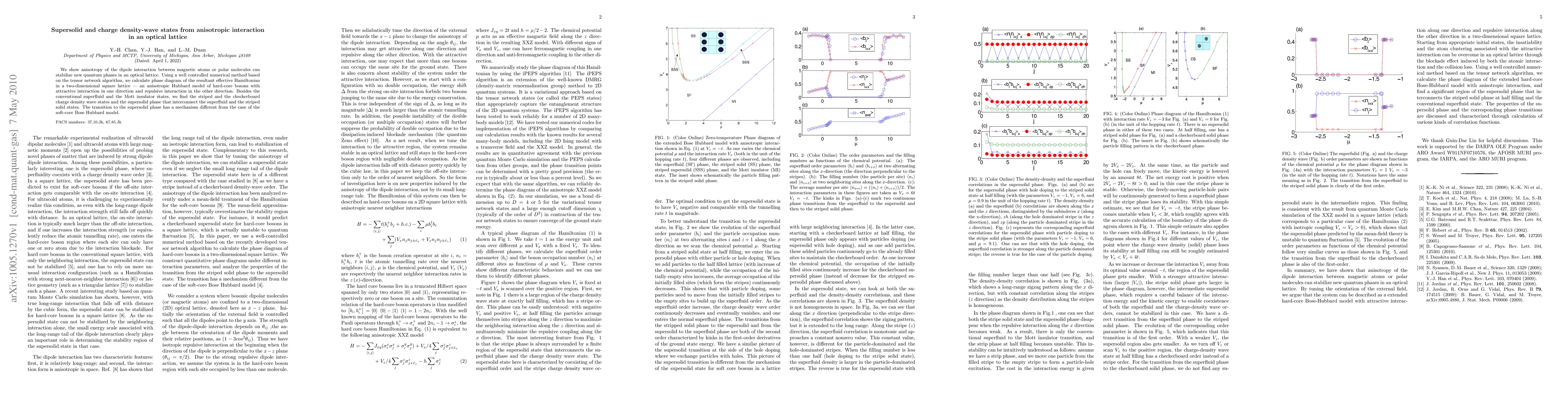 We show anisotropy of the dipole interaction between magnetic atoms or polar molecules can stabilize new quantum phases in an optical lattice. Using a well controlled numerical method based on the tensor network algorithm, we calculate phase diagram of the resultant effective Hamiltonian in a two-dimensional square lattice - an anisotropic Hubbard model of hard-core bosons with attractive interaction in one direction and repulsive interaction in the other direction. Besides the conventional superfluid and the Mott insulator states, we find the striped and the checkerboard charge density wave states and the supersolid phase that interconnect the superfluid and the striped solid states. The transition to the supersolid phase has a mechanism different from the case of the soft-core Bose Hubbard model.