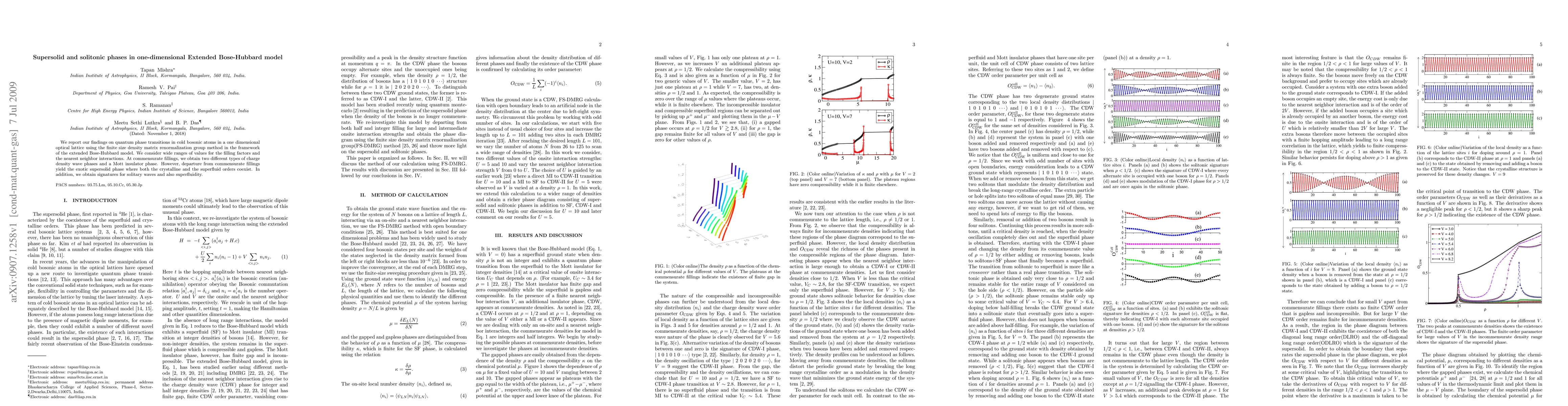 This study investigates quantum phase transitions in cold bosonic atoms using the extended Bose-Hubbard model in a one-dimensional optical lattice, revealing the emergence of supersolid phases alongside charge density wave and Mott insulator phases. The research also identifies solitonic behavior and superfluidity.