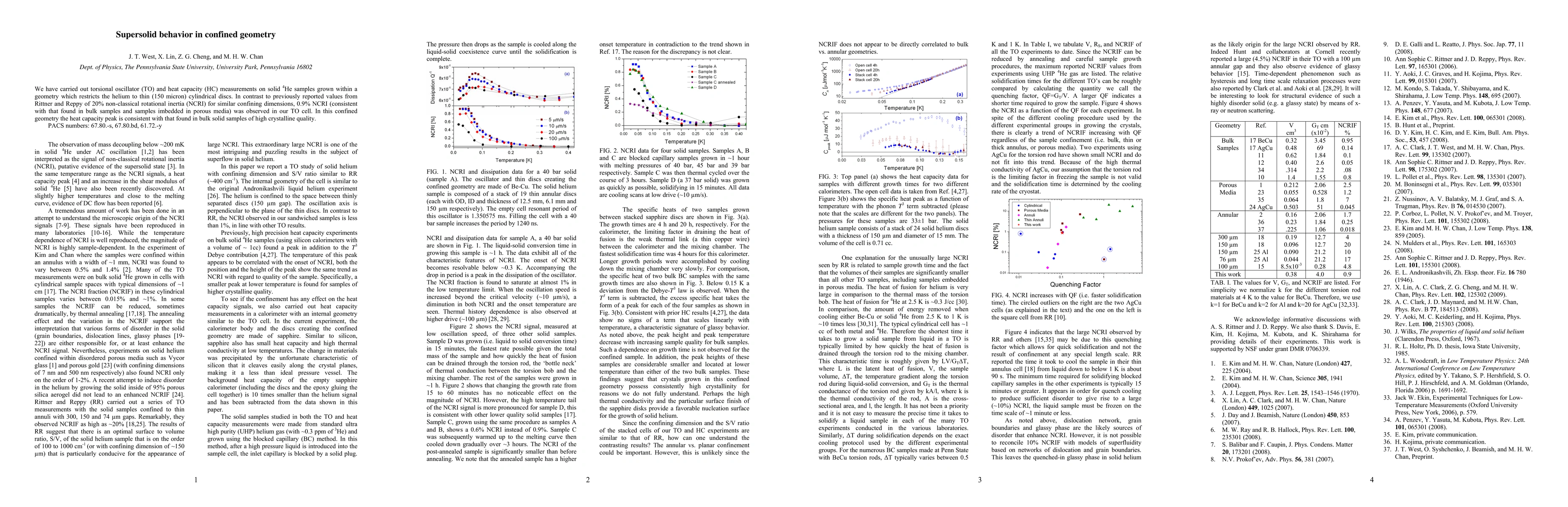 We have carried out torsional oscillator (TO) and heat capacity (HC) measurements on solid 4He samples grown within a geometry which restricts the helium to thin (150 um) cylindrical discs. In contrast to previously reported values from Rittner and Reppy of 20% non-classical rotational inertia (NCRI) for similar confining dimensions, 0.9% NCRI (consistent with that found in bulk samples and samples imbedded in porous media) was observed in our TO cell. In this confined geometry the heat capacity peak is consistent with that found in bulk solid samples of high crystalline quality.