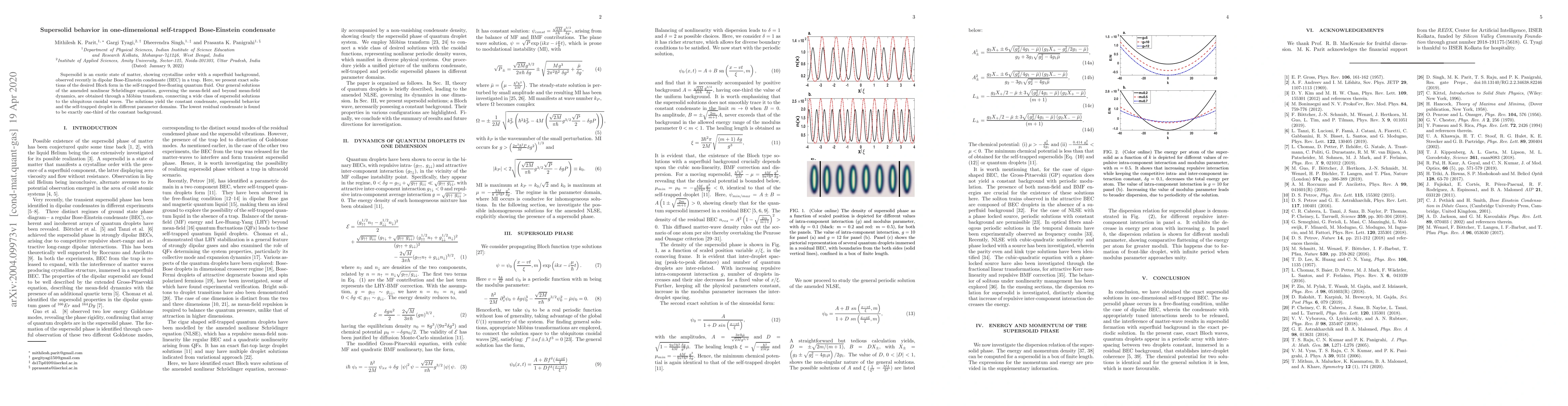 Supersolid is an exotic state of matter, showing crystalline order with a superfluid background, observed recently in dipolar Bose-Einstein condensate (BEC) in a trap. Here, we present exact solutions of the desired Bloch form in the self-trapped free-floating quantum fluid. Our general solutions of the amended nonlinear Schr{\"o}dinger equation, governing the mean-field and beyond mean-field dynamics, are obtained through a M{\"o}bius transform, connecting a wide class of supersolid solutions to the ubiquitous cnoidal waves. The solutions yield the constant condensate, supersolid behavior and the self-trapped droplet in different parameter domains. The lowest residual condensate is found to be exactly one-third of the constant background.