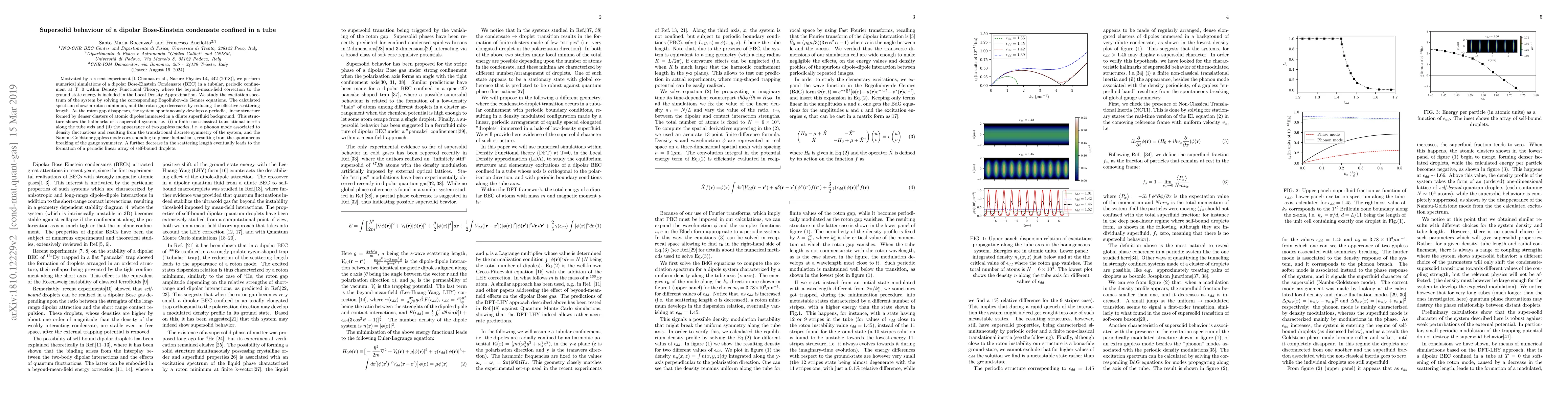 This paper investigates the supersolid behavior in a dipolar Bose-Einstein condensate confined in a tube, revealing a roton minimum in the excitation spectrum. As the roton gap diminishes, the system exhibits supersolid characteristics, including non-classical translational inertia and a gapless mode related to phase fluctuations.