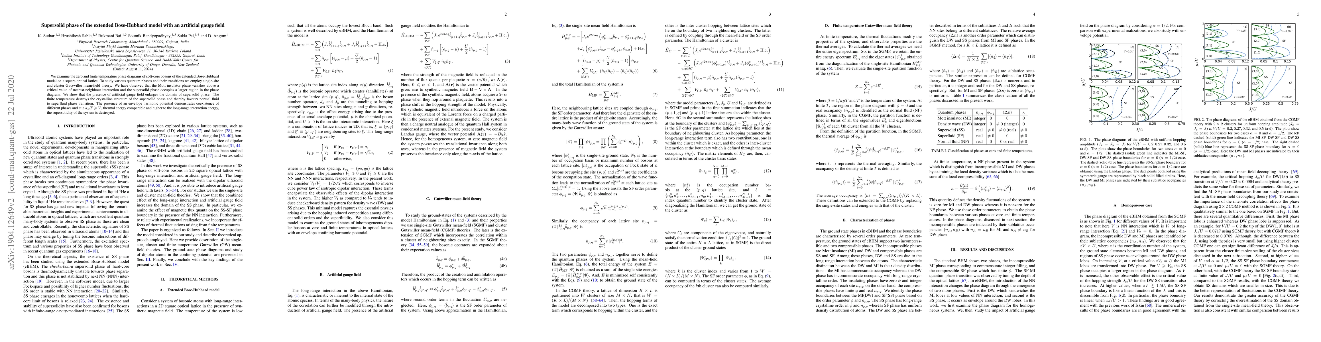 We examine the zero and finite temperature phase diagrams of soft-core bosons of the extended Bose-Hubbard model on a square optical lattice. To study various quantum phases and their transitions we employ single-site and cluster Gutzwiller mean-field theory. We have observed that the Mott insulator phase vanishes above a critical value of nearest-neighbour interaction and the supersolid phase occupies a larger region in the phase diagram. We show that the presence of artificial gauge field enlarges the domain of supersolid phase. The finite temperature destroys the crystalline structure of the supersolid phase and thereby favours normal fluid to superfluid phase transition. The presence of an envelope harmonic potential demonstrates coexistence of different phases and at $z~k_{B}T\geqslant V$, thermal energy comparable and higher to the long-range interaction energy, the supersolidity of the system is destroyed.