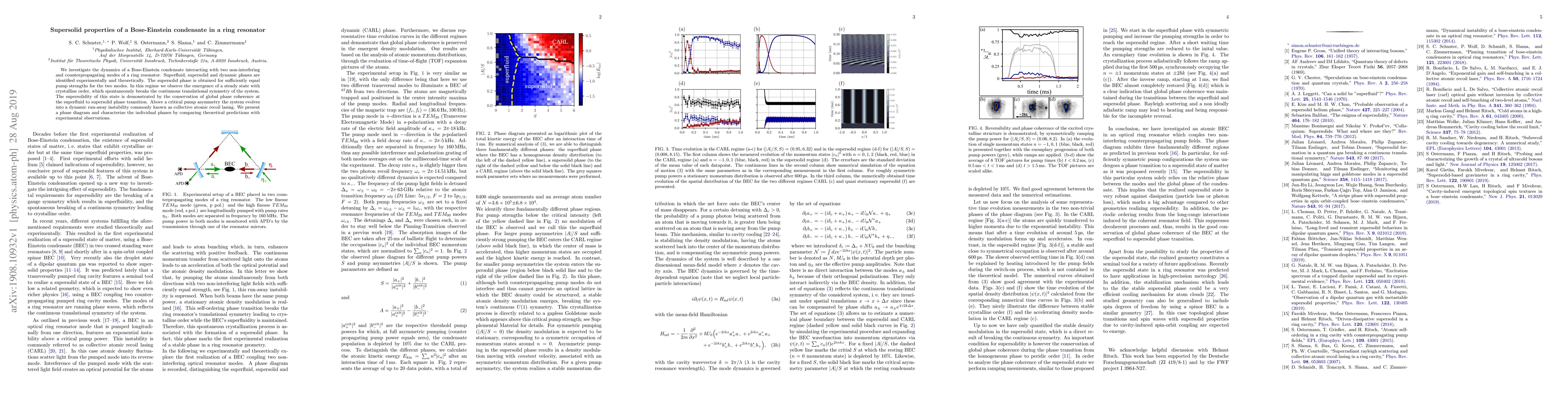 This paper explores the dynamics of a Bose-Einstein condensate interacting with counterpropagating modes in a ring resonator, identifying superfluid, supersolid, and dynamic phases. The supersolid phase emerges with equal pump strengths, showing crystalline order and phase coherence, while a collective atomic recoil lasing instability occurs with pump asymmetry.