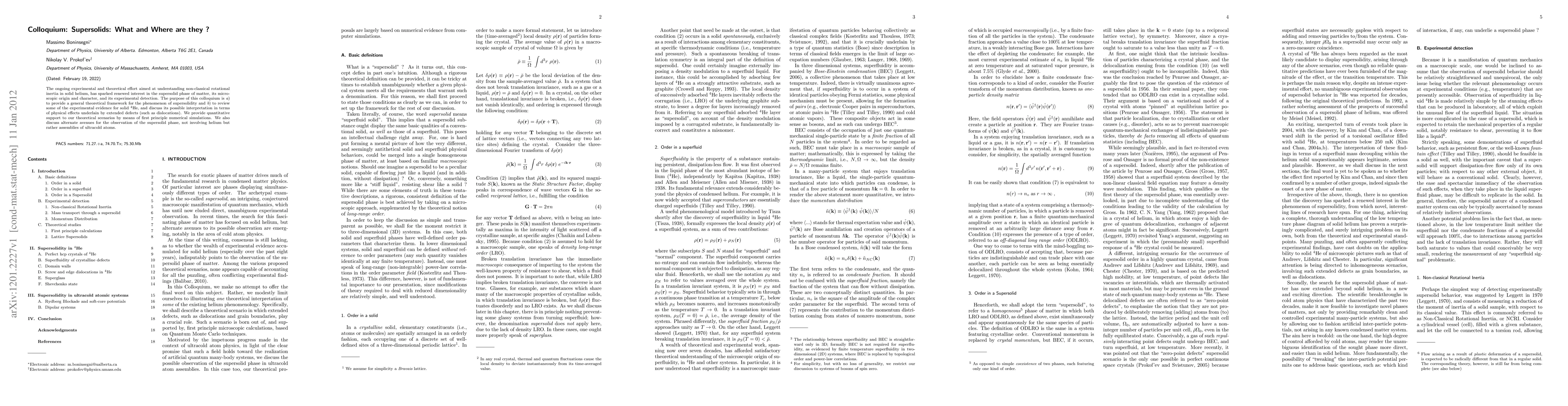 The ongoing experimental and theoretical effort aimed at understanding non-classical rotational inertia in solid helium, has sparked renewed interest in the supersolid phase of matter, its microscopic origin and character, and its experimental detection. The purpose of this colloquium is a) to provide a general theoretical framework for the phenomenon of supersolidity and b) to review some of the experimental evidence for solid Helium-four, and discuss its possible interpretation in terms of physical effects underlain by extended defects (such as dislocations). We provide quantitative support to our theoretical scenarios by means of first principle numerical simulations. We also discuss alternate avenues for the observation of the supersolid phase, not involving helium but rather assemblies of ultracold atoms.