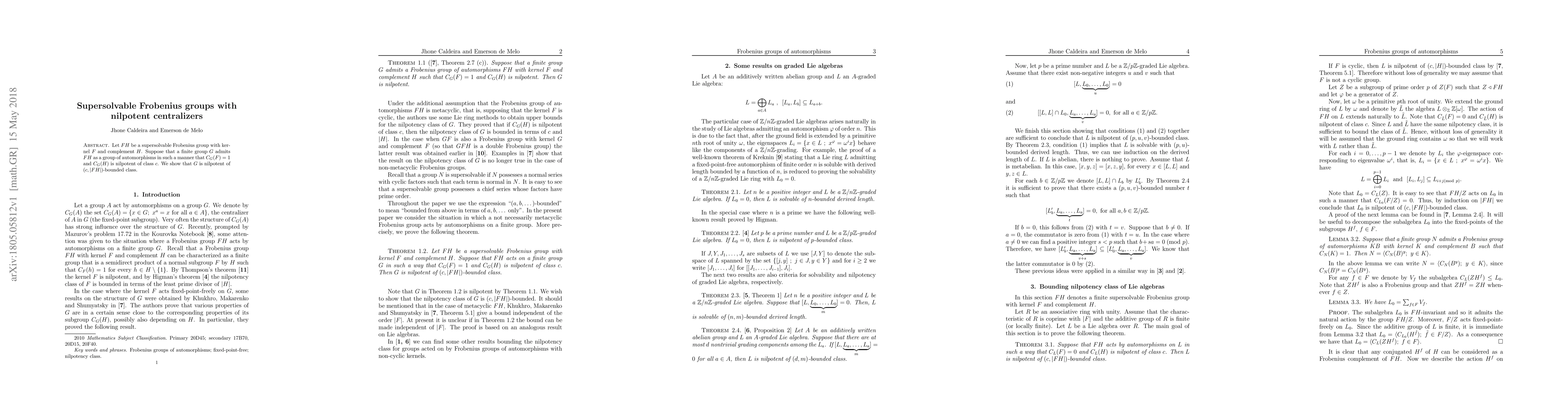 Summary: This paper proves that if a finite group $G$ has a supersolvable Frobenius group $FH$ acting as automorphisms with trivial centralizer of the kernel $F$ and nilpotent centralizer of the complement $H$ of class $c$, then $G$ itself is nilpotent of class bounded by $(c, |FH|)$.