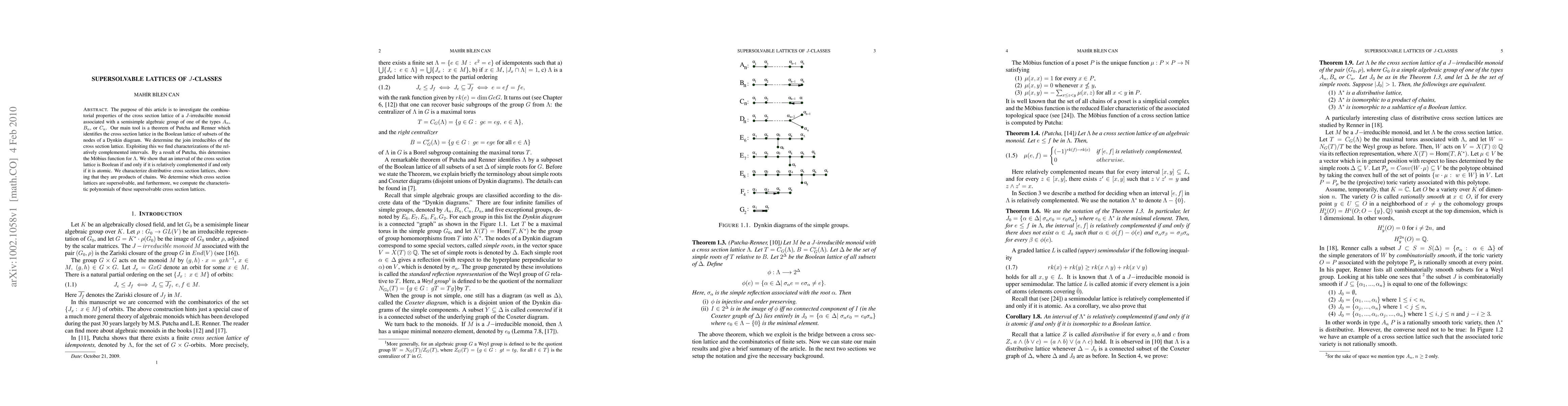 The purpose of this article is to investigate the combinatorial properties of the cross section lattice of a $J$-irreducible monoid associated with a semisimple algebraic group of one of the types $A_n$, $B_n$, or $C_n$. Our main tool is a theorem of Putcha and Renner which identifies the cross section lattice in the Boolean lattice of subsets of the nodes of a Dynkin diagram. We determine the join irreducibles of the cross section lattice. Exploiting this we find characterizations of the relatively complemented intervals. By a result of Putcha, this determines the M\"{o}bius function for $\Lambda$. We show that an interval of the cross section lattice is Boolean if and only if it is relatively complemented if and only if it is atomic. We characterize distributive cross section lattices, showing that they are products of chains. We determine which cross section lattices are supersolvable, and furthermore, we compute the characteristic polynomials of these supersolvable cross section lattices. At the end of the article we indicate some future research directions.