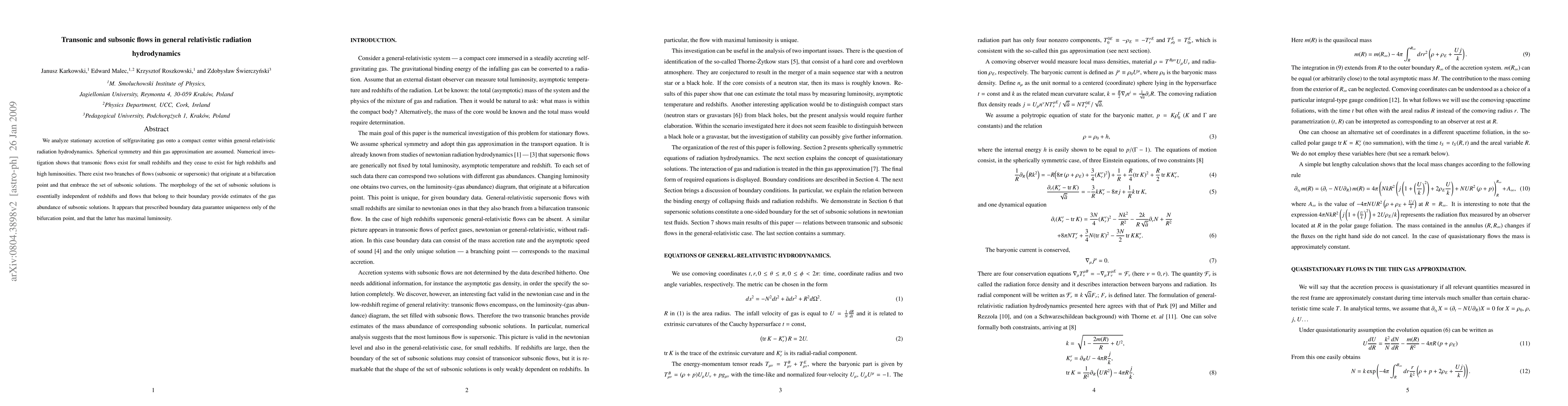 This paper investigates stationary accretion flows in general relativistic radiation hydrodynamics, revealing the existence of transonic flows under low redshifts and high luminosities. It identifies two flow branches—subsonic and supersonic—originating from a bifurcation point, with the subsonic set's morphology remaining largely unchanged across different redshifts.