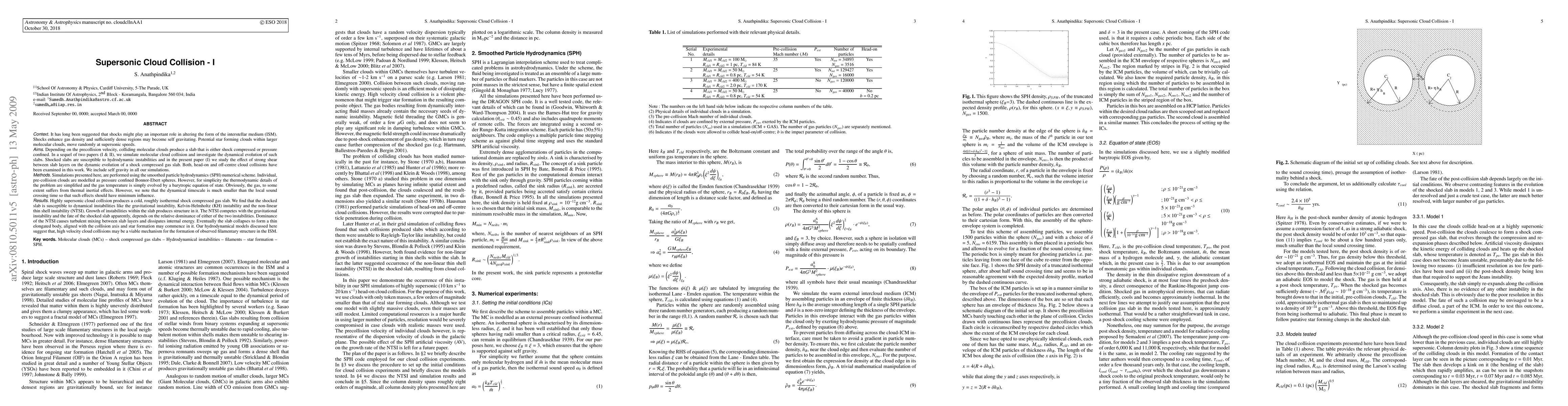 It has long been suggested that shocks might play an important role in altering the form of the interstellar medium (ISM). Shocks enhance gas density and sufficiently dense regions may become self gravitating. Potential star forming clouds within larger molecular clouds, move randomly at supersonic speeds. Depending on the precollision velocity, colliding molecular clouds produce a slab that is either shock compressed or pressure confined. In a sequel of two papers (I & II), we simulate molecular cloud collision and investigate the dynamical evolution of such slabs. Shocked slabs are susceptible to hydrodynamic instabilities and in the present paper (I) we study the effect of strong shear between slab layers on the dynamic evolution of a shock compressed gas slab. Both, head-on and off-centre cloud collisions have been examined in this work. We include self gravity in all our simulations. Simulations presented here, are performed using the smoothed particle hydrodynamics (SPH) numerical scheme. Individual, pre-collision clouds are modelled as pressure confined Bonnor-Ebert spheres. However, in the interest of brevity the thermodynamic details of the problem are simplified and the gas temperature is simply evolved by a barytropic equation of state. Obviously, the gas, to some extent suffers from thermal inertial effects. However, we note that the dynamical timescale is much smaller than the local sound crossing time so that such effects should have minimum influence.