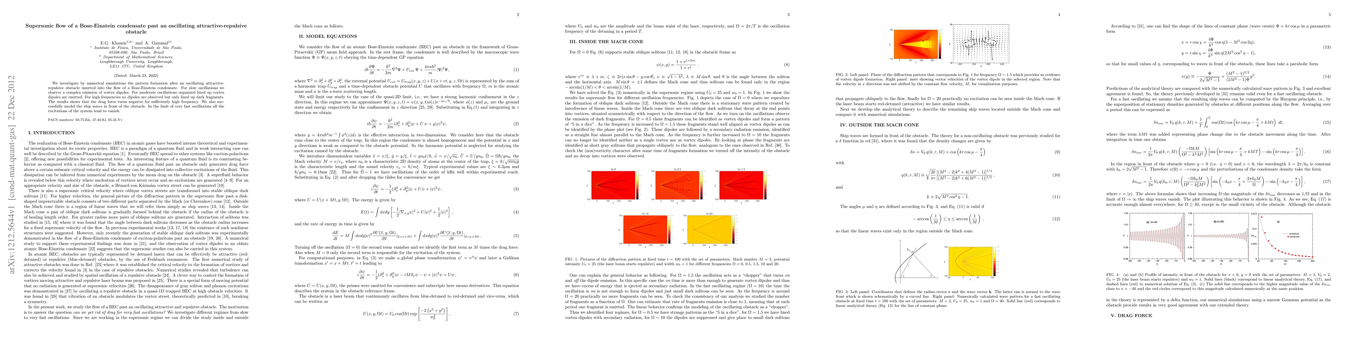 This paper studies the pattern formation in supersonic flows of Bose-Einstein condensates around an oscillating obstacle, revealing complex vortex dipole emissions at low frequencies, organized dipole lines at moderate frequencies, and vanishing excitations at high frequencies, demonstrating a negative drag force at sufficiently high oscillation frequencies.