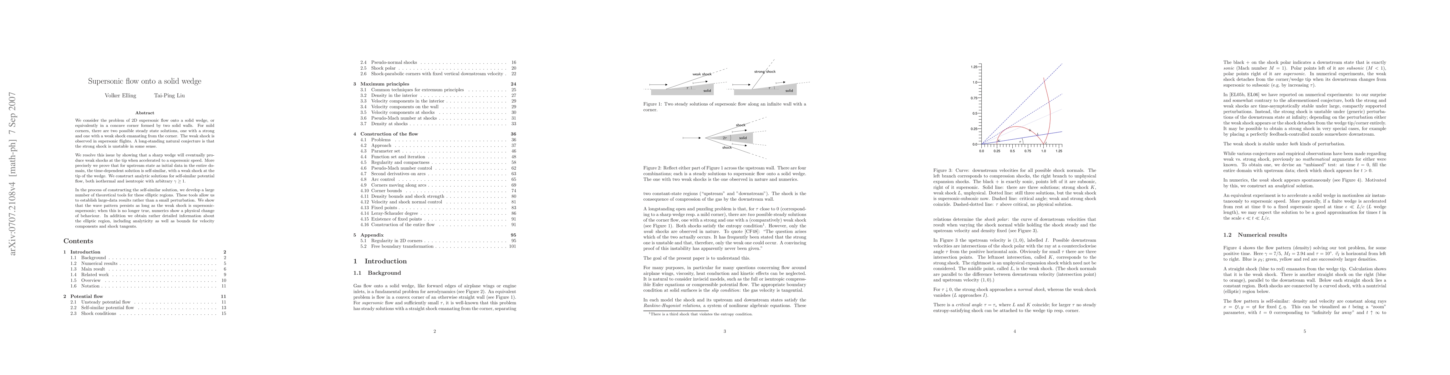 This paper investigates the dynamics of 2D supersonic flow onto a solid wedge, proving that accelerated wedges produce weak shocks at the tip rather than strong shocks. It develops theoretical tools for self-similar potential flow solutions and shows that the weak shock persists as long as it remains supersonic-supersonic.