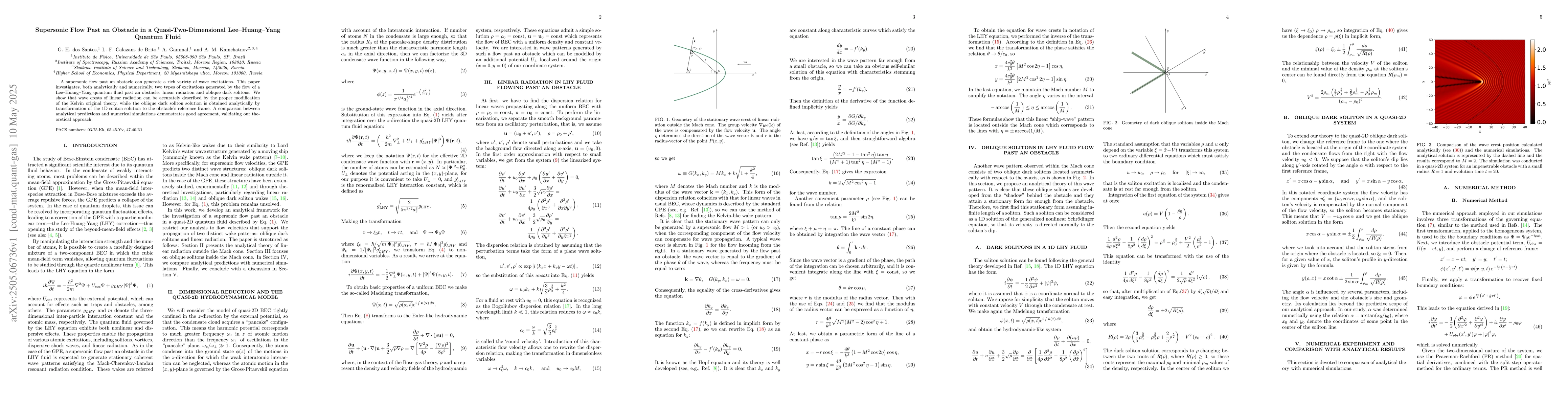 The research employs analytical and numerical methods to study supersonic flow past an obstacle in a quasi-two-dimensional Lee-Huang-Yang quantum fluid, focusing on linear radiation and oblique dark solitons.