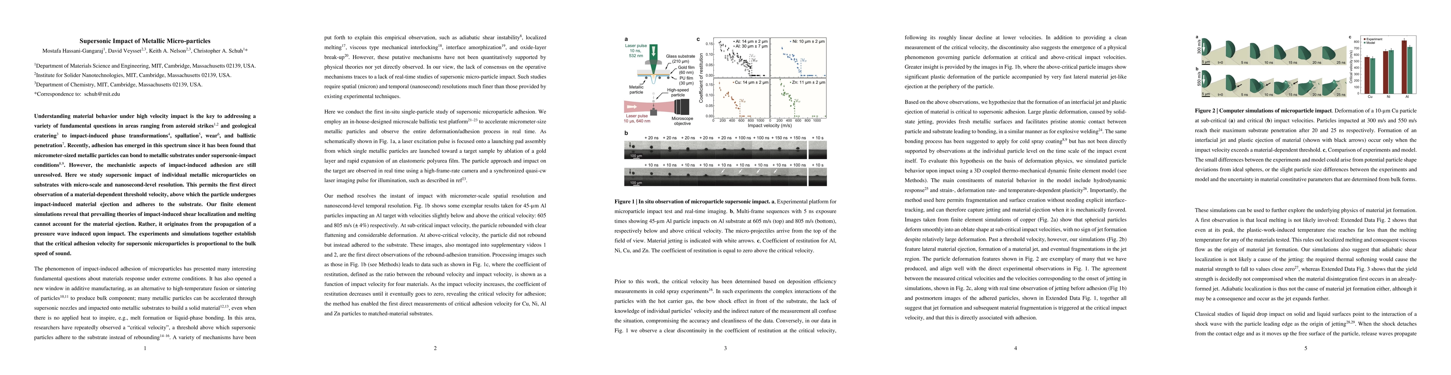 Understanding material behavior under high velocity impact is the key to addressing a variety of fundamental questions in areas ranging from asteroid strikes and geological cratering to impact-induced phase transformations, spallation, wear, and ballistic penetration. Recently, adhesion has emerged in this spectrum since it has been found that micrometer-sized metallic particles can bond to metallic substrates under supersonic-impact conditions. However, the mechanistic aspects of impact-induced adhesion are still unresolved. Here we study supersonic impact of individual metallic microparticles on substrates with micro-scale and nanosecond-level resolution. This permits the first direct observation of a material-dependent threshold velocity, above which the particle undergoes impact-induced material ejection and adheres to the substrate. Our finite element simulations reveal that prevailing theories of impact-induced shear localization and melting cannot account for the material ejection. Rather, it originates from the propagation of a pressure wave induced upon impact. The experiments and simulations together establish that the critical adhesion velocity for supersonic microparticles is proportional to the bulk speed of sound.