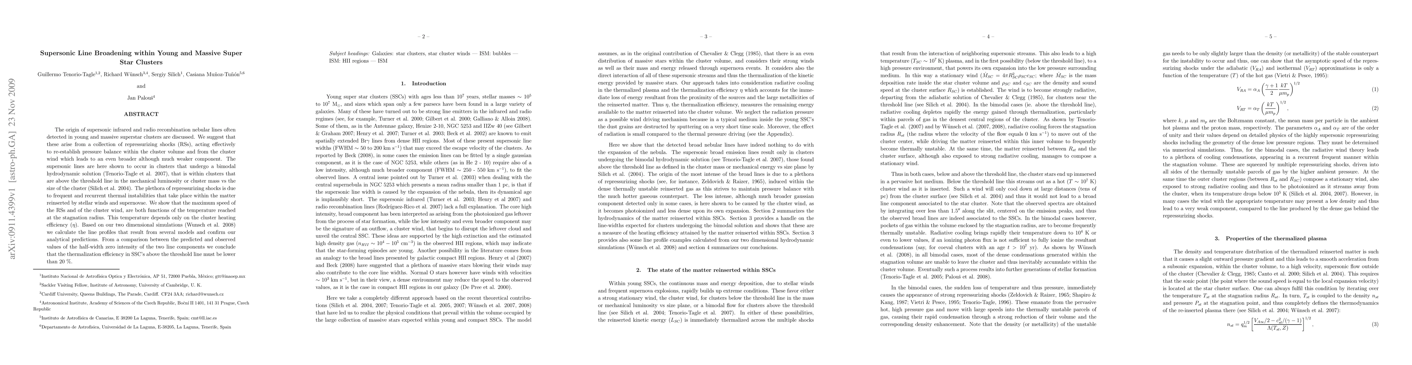 The origin of supersonic infrared and radio recombination nebular lines often detected in young and massive superstar clusters are discussed. We suggest that these arise from a collection of repressurizing shocks (RSs), acting effectively to re-establish pressure balance within the cluster volume and from the cluster wind which leads to an even broader although much weaker component. The supersonic lines are here shown to occur in clusters that undergo a bimodal hydrodynamic solution (Tenorio-Tagle et al. 2007), that is within clusters that are above the threshold line in the mechanical luminosity or cluster mass vs the size of the cluster (Silich et al. 2004). The plethora of repressurizing shocks is due to frequent and recurrent thermal instabilities that take place within the matter reinserted by stellar winds and supernovae. We show that the maximum speed of the RSs and of the cluster wind, are both functions of the temperature reached at the stagnation radius. This temperature depends only on the cluster heating efficiency ($\eta$). Based on our two dimensional simulations (Wunsch et al. 2008) we calculate the line profiles that result from several models and confirm our analytical predictions. From a comparison between the predicted and observed values of the half-width zero intensity of the two line components we conclude that the thermalization efficiency in SSC's above the threshold line must be lower than 20%.