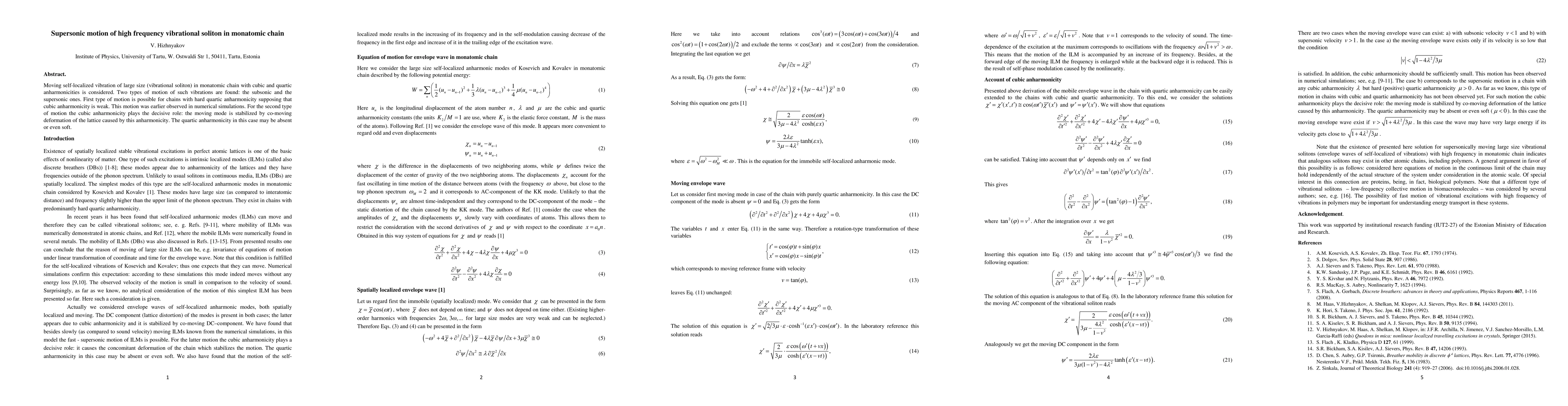 This paper investigates large-size vibrational solitons in monatomic chains with cubic and quartic anharmonicities, revealing two types of motion: subsonic and supersonic. The subsonic motion occurs in chains with weak cubic and strong quartic anharmonicities, while the supersonic motion is stabilized by cubic anharmonicity, allowing for either weak or absent quartic anharmonicity.