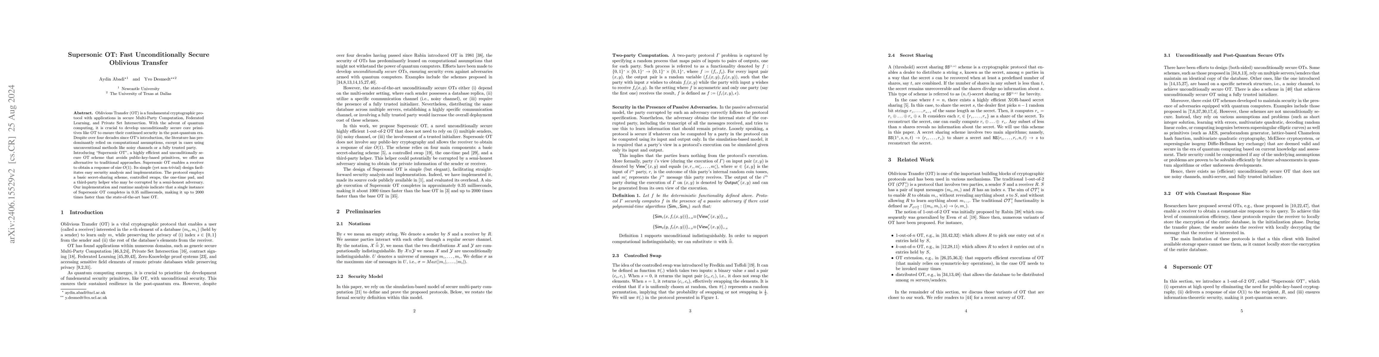 "Supersonic OT" introduces a highly efficient, unconditionally secure oblivious transfer protocol that operates without public-key cryptography, utilizing a simple secret-sharing scheme and controlled swaps. It completes a single instance in 0.35 milliseconds, up to 2000 times faster than existing base OT protocols.
