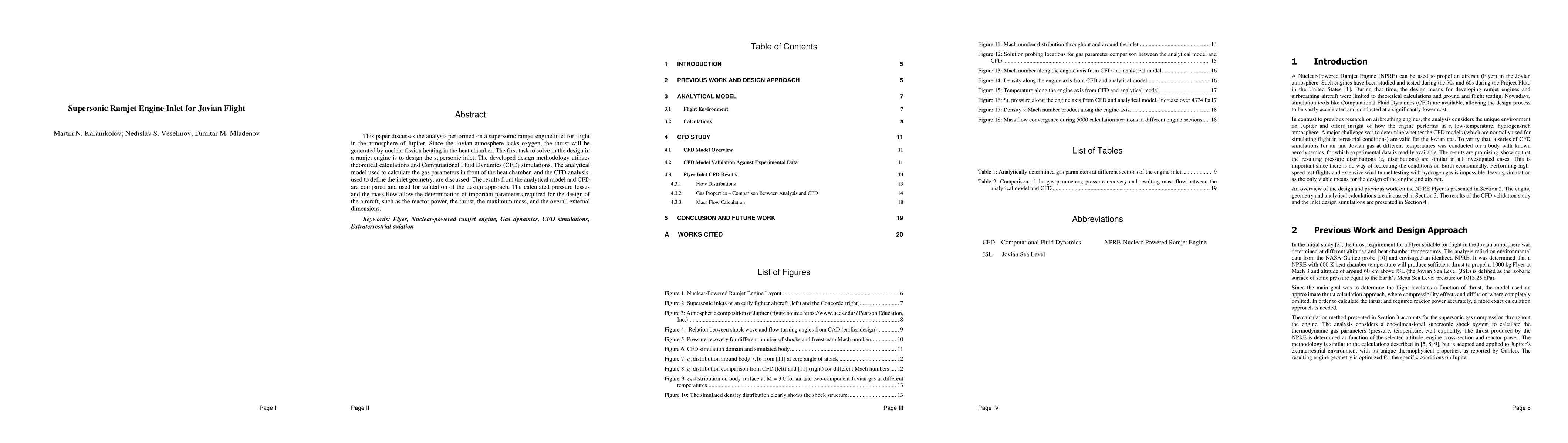 This paper discusses the analysis performed on a supersonic ramjet engine inlet for flight in the atmosphere of Jupiter. Since the Jovian atmosphere lacks oxygen, the thrust will be generated by nuclear fission heating in the heat chamber. The first task to solve in the design in a ramjet engine is to design the supersonic inlet. The developed design methodology utilizes theoretical calculations and Computational Fluid Dynamics (CFD) simulations. The analytical model used to calculate the gas parameters in front of the heat chamber, and the CFD analysis, used to define the inlet geometry, are discussed. The results from the analytical model and CFD are compared and used for validation of the design approach. The calculated pressure losses and the mass flow allow the determination of important parameters required for the design of the aircraft, such as the reactor power, the thrust, the maximum mass, and the overall external dimensions.