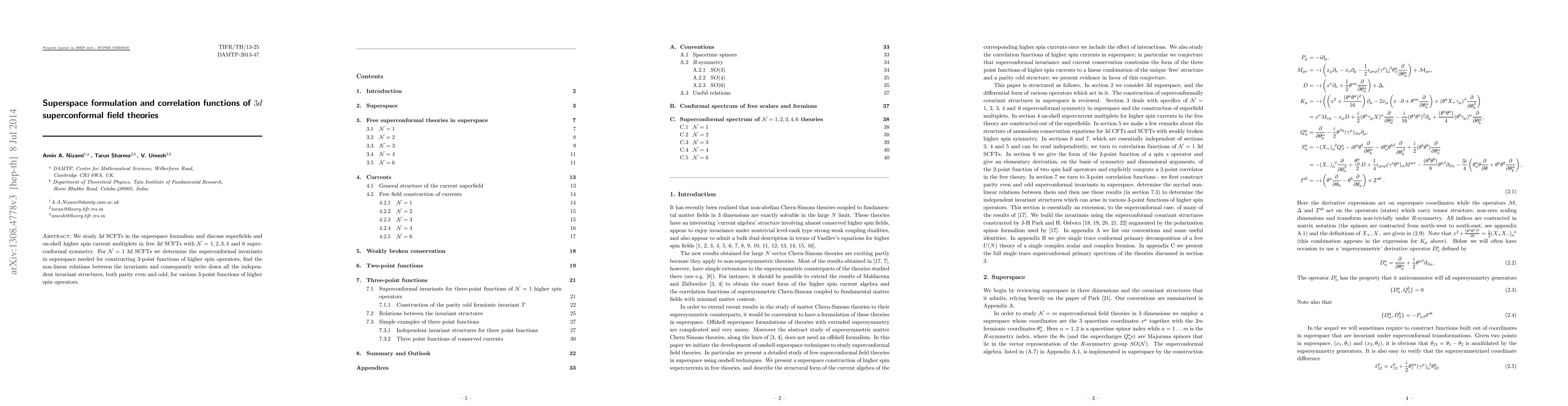 This paper explores $3d$ superconformal field theories (SCFTs) using superspace formalism, focusing on $\mathcal{N}=1$ to $\mathcal{N}=6$ symmetries. It determines superconformal invariants for constructing 3-point functions of higher spin operators and identifies the non-linear relations and independent invariant structures for these functions.