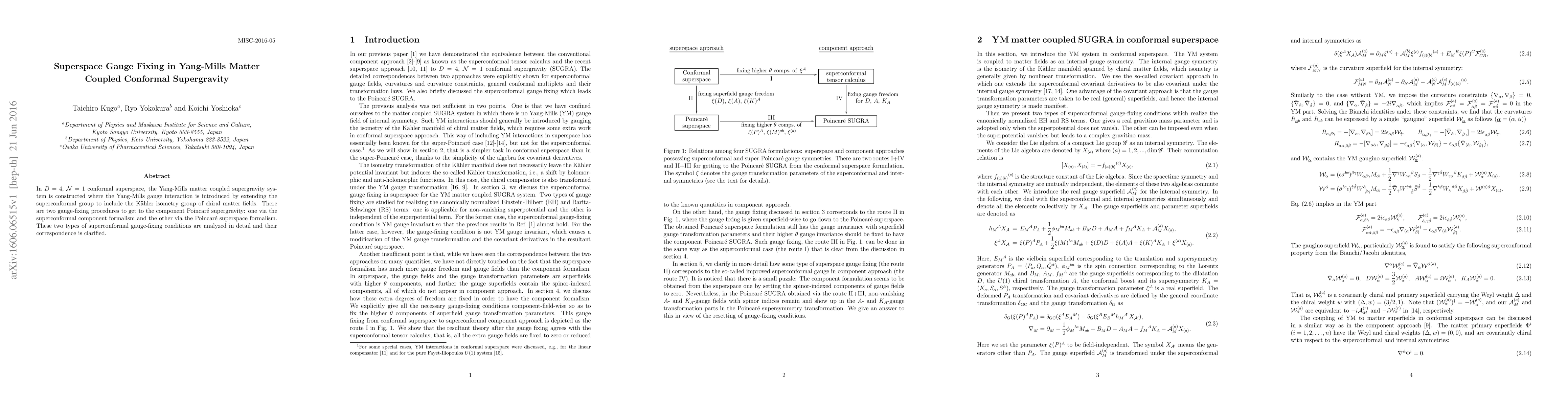 In $D=4$, $\cal{N}=1$ conformal superspace, the Yang-Mills matter coupled supergravity system is constructed where the Yang-Mills gauge interaction is introduced by extending the superconformal group to include the K\"ahler isometry group of chiral matter fields. There are two gauge-fixing procedures to get to the component Poincar\'e supergravity: one via the superconformal component formalism and the other via the Poincar\'e superspace formalism. These two types of superconformal gauge-fixing conditions are analyzed in detail and their correspondence is clarified.