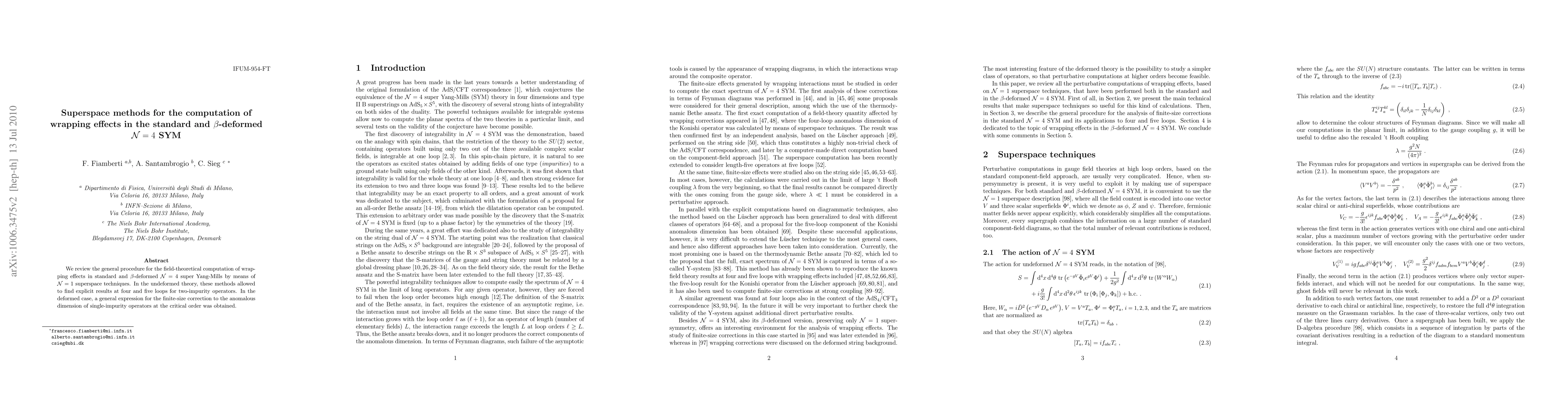 We review the general procedure for the field-theoretical computation of wrapping effects in standard and beta-deformed N=4 super Yang-Mills by means of N=1 superspace techniques. In the undeformed theory, these methods allowed to find explicit results at four and five loops for two-impurity operators. In the deformed case, a general expression for the finite-size correction to the anomalous dimension of single-impurity operators at the critical order was obtained.