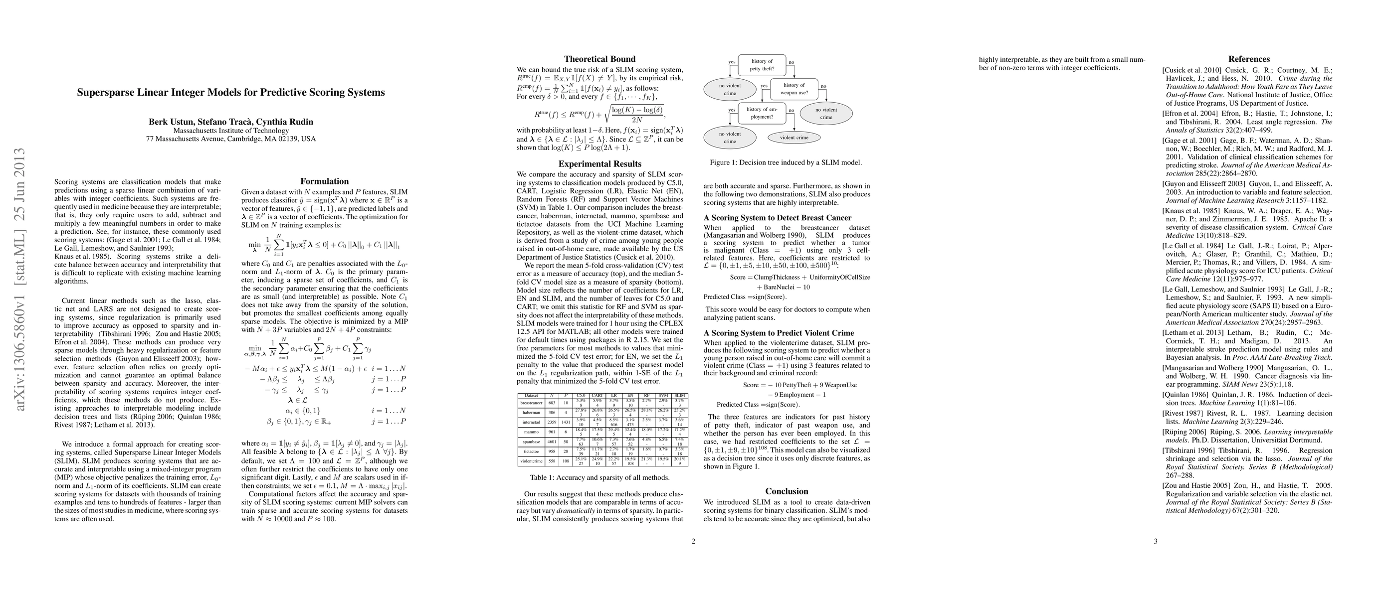 We introduce Supersparse Linear Integer Models (SLIM) as a tool to create scoring systems for binary classification. We derive theoretical bounds on the true risk of SLIM scoring systems, and present experimental results to show that SLIM scoring systems are accurate, sparse, and interpretable classification models.