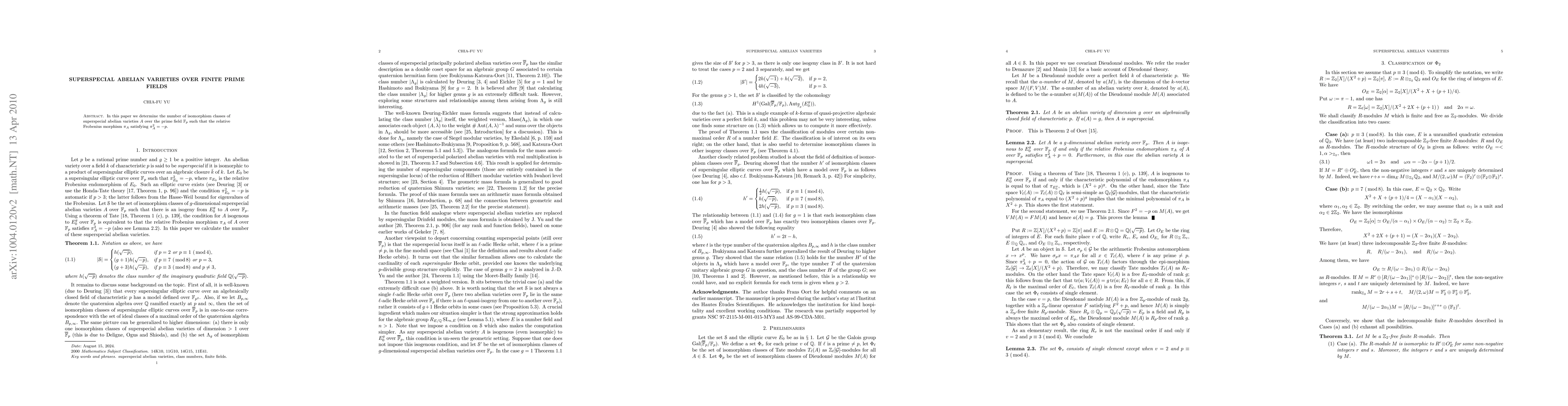 This paper calculates the number of isomorphism classes of superspecial abelian varieties over the finite prime field $\Fp$ where the relative Frobenius morphism $\pi_A$ satisfies $\pi_A^2=-p$. The result is derived through a detailed analysis of the algebraic structure of these varieties.