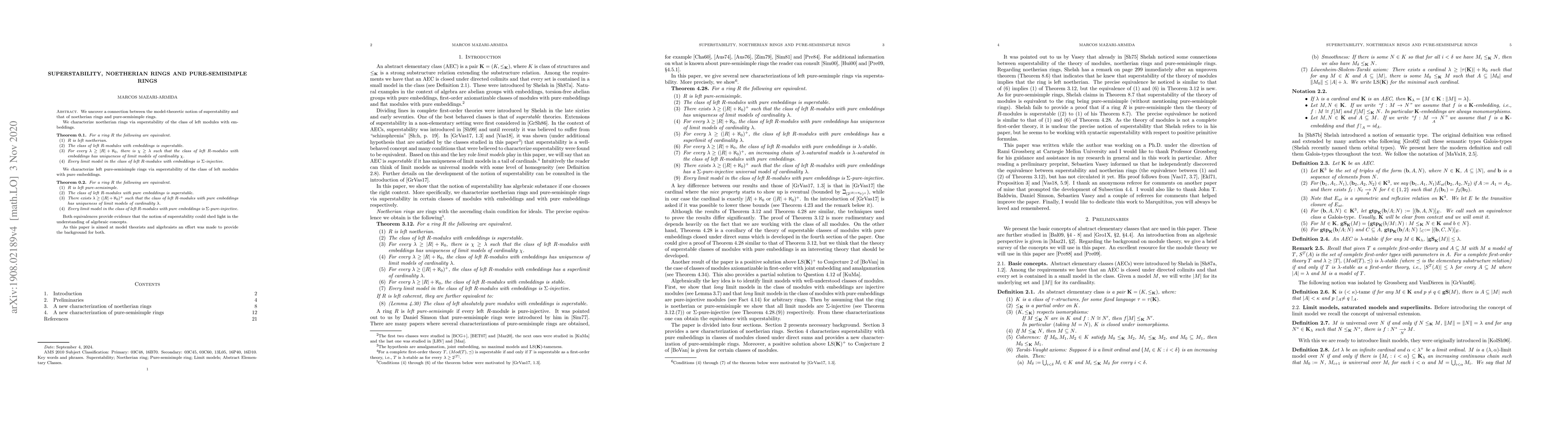 This paper establishes connections between model-theoretic superstability and algebraic properties of rings, proving equivalences between superstability of module classes and noetherian or pure-semisimple characteristics for rings. It suggests that superstability may enhance the understanding of algebraic structures.