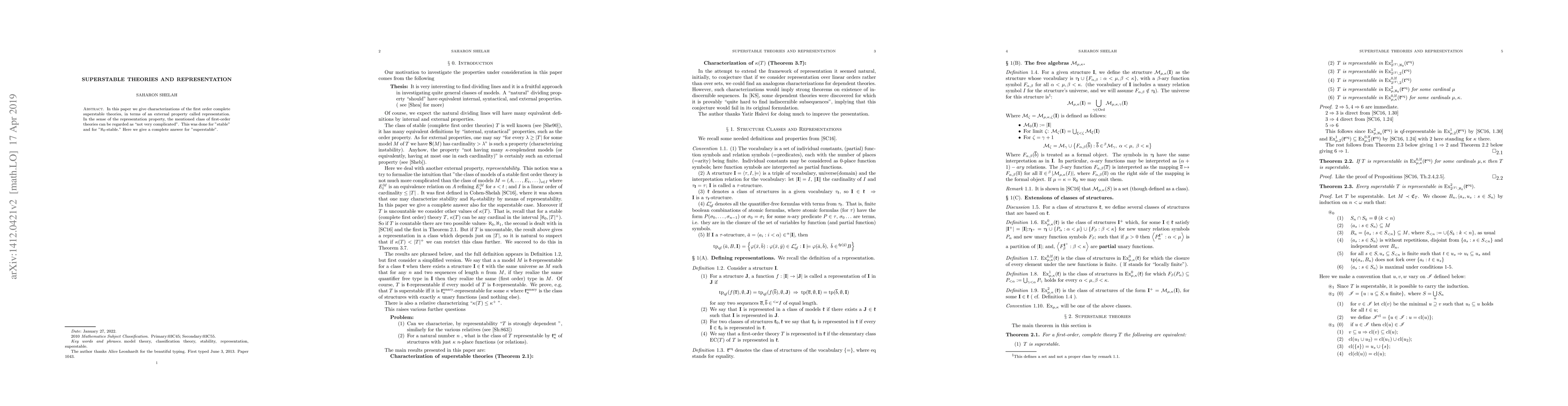 In this paper we give characterizations of the super-stable theories, in terms of an external property called representation. In the sense of the representation property, the mentioned class of first-order theories can be regarded as "not very complicated". This was done for "stable" and for "aleph_0-stable". Here we give a complete answer for "superstable".