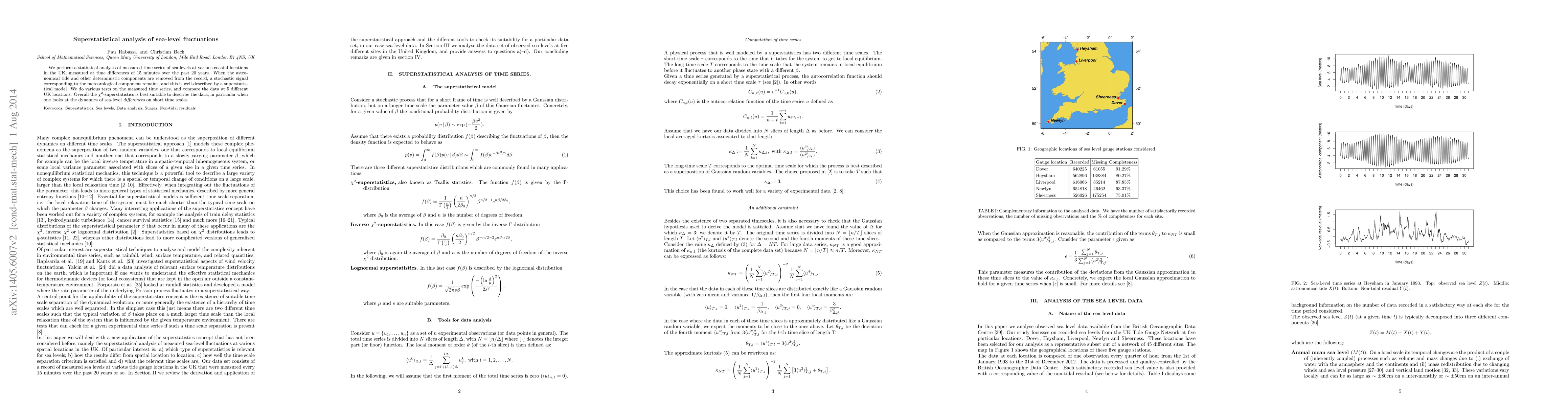 We perform a statistical analysis of measured time series of sea levels at various coastal locations in the UK, measured at time differences of 15 minutes over the past 20 years. When the astronomical tide and other deterministic components are subtracted, a stochastic signal remains which is well-described by a superstatistical model. We do various tests on the measured time series, and compare the data of 5 different UK locations. Overall it appears that $\chi^2$-superstatistics is best suitable to describe the data, in particular when one looks at the dynamics of sealevel {\em differences} on short time scales.