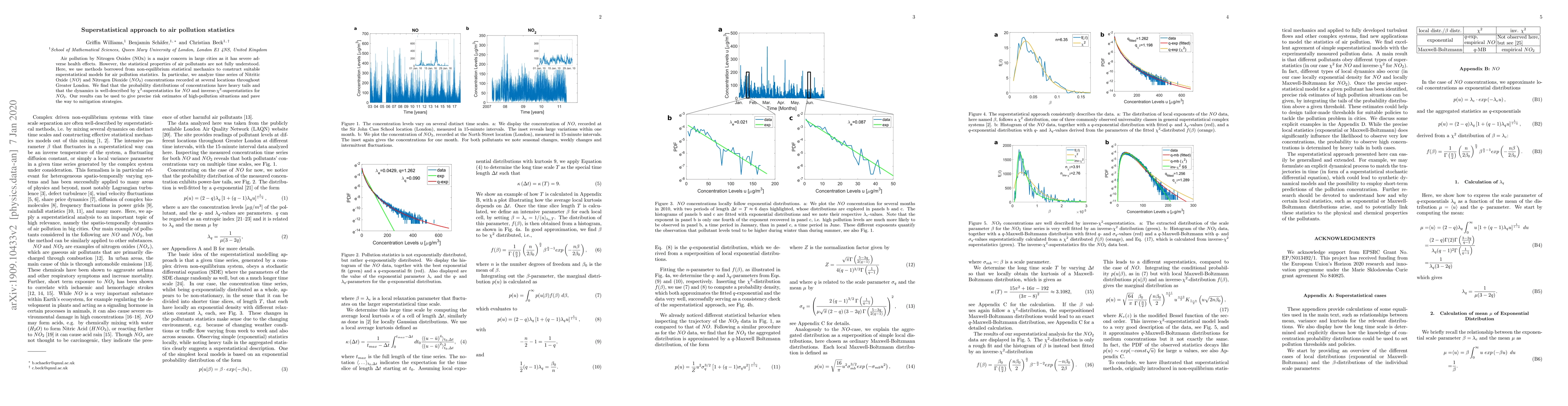 This paper employs superstatistical models from nonequilibrium statistical mechanics to analyze air pollution data in Greater London, revealing heavy-tailed distributions for Nitric Oxide ($NO$) and Nitrogen Dioxide ($NO_2$) concentrations. The study finds that $\chi^2$ superstatistics fits $NO$ and inverse $\chi^2$ superstatistics fits $NO_2$, providing a framework for precise risk assessments and potential mitigation strategies.