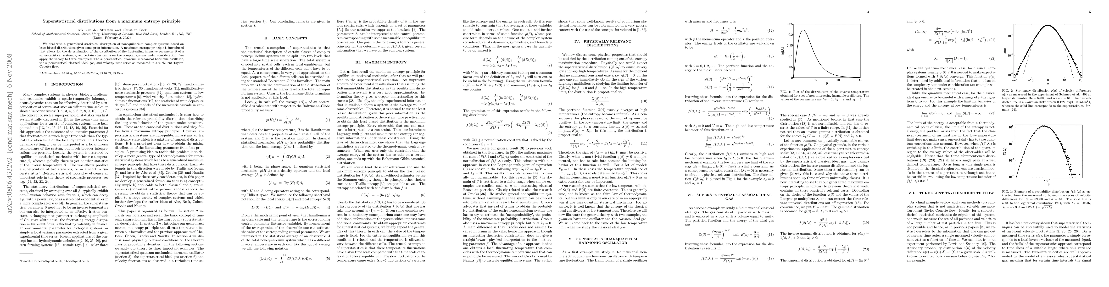 This paper introduces a maximum entropy principle for determining least biased distributions in nonequilibrium complex systems, focusing on the fluctuating intensive parameter $\beta$. It applies the theory to three examples: a superstatistical quantum harmonic oscillator, a classical ideal gas, and turbulent flow velocity time series.