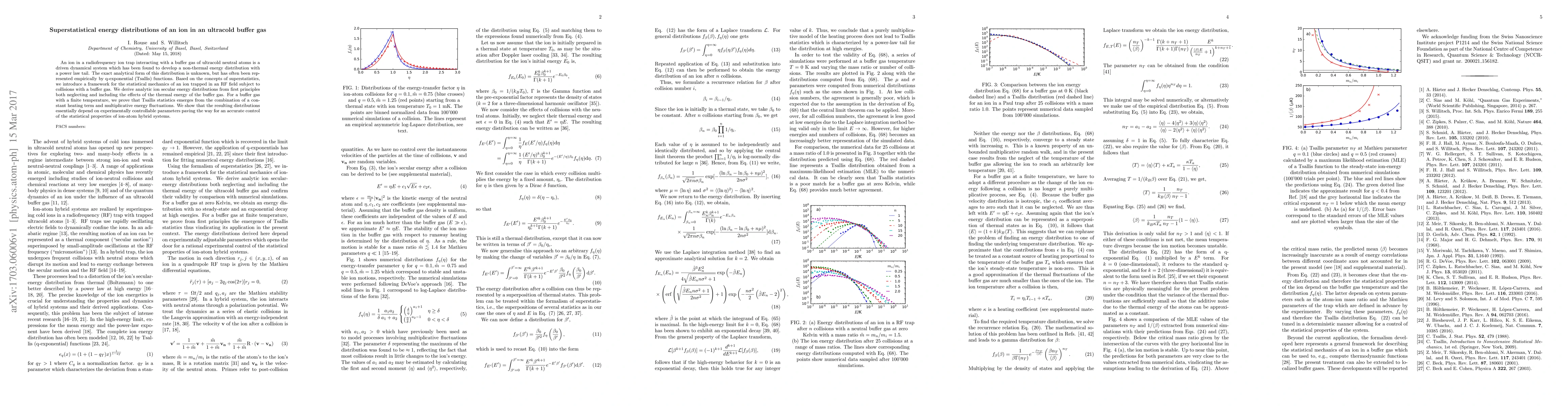 This paper develops a superstatistical framework to describe the energy distribution of an ion in a radiofrequency trap interacting with ultracold buffer gas, showing that Tsallis statistics arise from a combination of constant heating and multiplicative energy fluctuations. The derived distributions depend on experimentally controllable parameters, enabling precise control over the statistical properties of ion-atom systems.