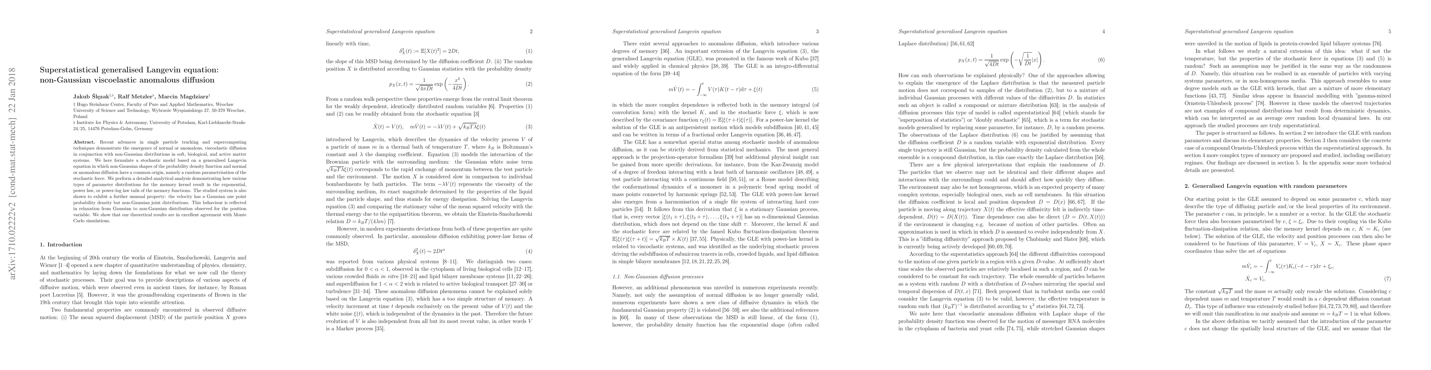 Recent advances in single particle tracking and supercomputing techniques demonstrate the emergence of normal or anomalous, viscoelastic diffusion in conjunction with non-Gaussian distributions in soft, biological, and active matter systems. We here formulate a stochastic model based on a generalised Langevin equation in which non-Gaussian shapes of the probability density function and normal or anomalous diffusion have a common origin, namely a random parametrisation of the stochastic force. We perform a detailed analytical analysis demonstrating how various types of parameter distributions for the memory kernel result in the exponential, power law, or power-log law tails of the memory functions. The studied system is also shown to exhibit a further unusual property: the velocity has a Gaussian one point probability density but non-Gaussian joint distributions. This behaviour is reflected in relaxation from Gaussian to non-Gaussian distribution observed for the position variable. We show that our theoretical results are in excellent agreement with Monte Carlo simulations.